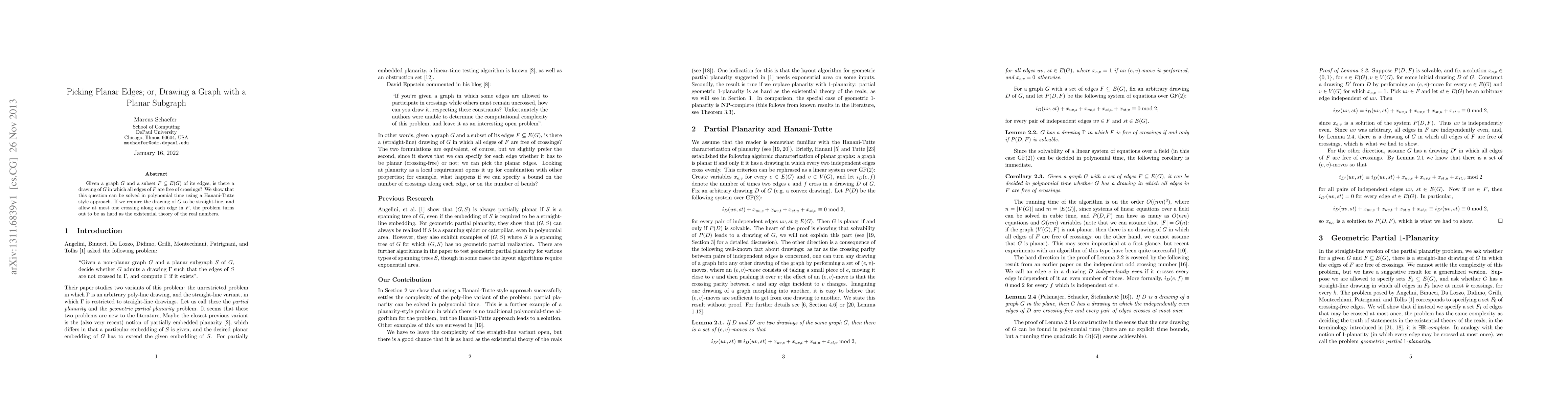 Given a graph $G$ and a subset $F \subseteq E(G)$ of its edges, is there a drawing of $G$ in which all edges of $F$ are free of crossings? We show that this question can be solved in polynomial time using a Hanani-Tutte style approach. If we require the drawing of $G$ to be straight-line, and allow at most one crossing along each edge in $F$, the problem turns out to be as hard as the existential theory of the real numbers.