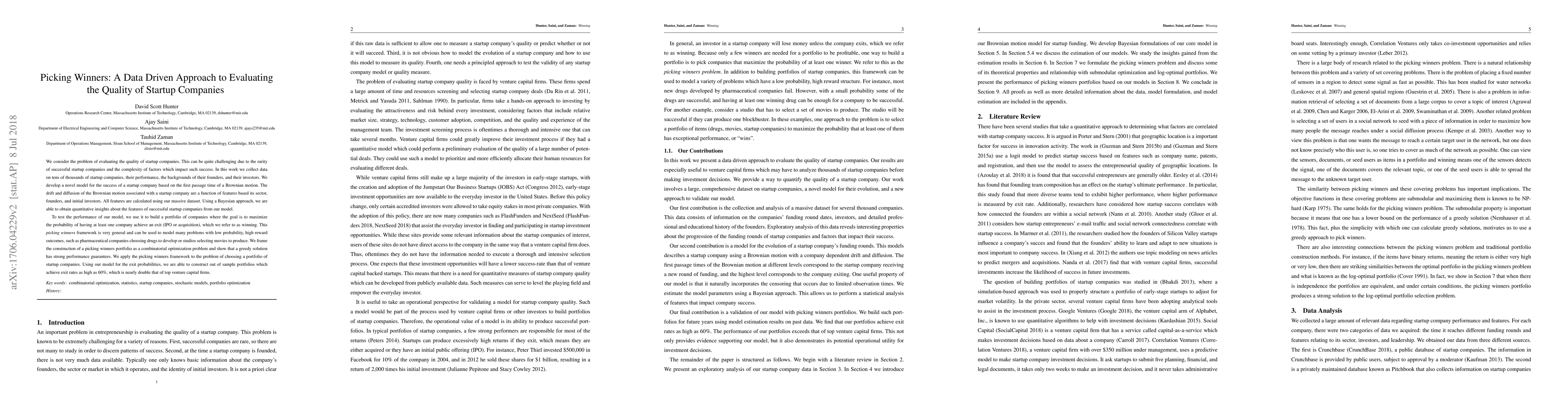 We consider the problem of evaluating the quality of startup companies. This can be quite challenging due to the rarity of successful startup companies and the complexity of factors which impact such success. In this work we collect data on tens of thousands of startup companies, their performance, the backgrounds of their founders, and their investors. We develop a novel model for the success of a startup company based on the first passage time of a Brownian motion. The drift and diffusion of the Brownian motion associated with a startup company are a function of features based its sector, founders, and initial investors. All features are calculated using our massive dataset. Using a Bayesian approach, we are able to obtain quantitative insights about the features of successful startup companies from our model. To test the performance of our model, we use it to build a portfolio of companies where the goal is to maximize the probability of having at least one company achieve an exit (IPO or acquisition), which we refer to as winning. This $\textit{picking winners}$ framework is very general and can be used to model many problems with low probability, high reward outcomes, such as pharmaceutical companies choosing drugs to develop or studios selecting movies to produce. We frame the construction of a picking winners portfolio as a combinatorial optimization problem and show that a greedy solution has strong performance guarantees. We apply the picking winners framework to the problem of choosing a portfolio of startup companies. Using our model for the exit probabilities, we are able to construct out of sample portfolios which achieve exit rates as high as 60%, which is nearly double that of top venture capital firms.