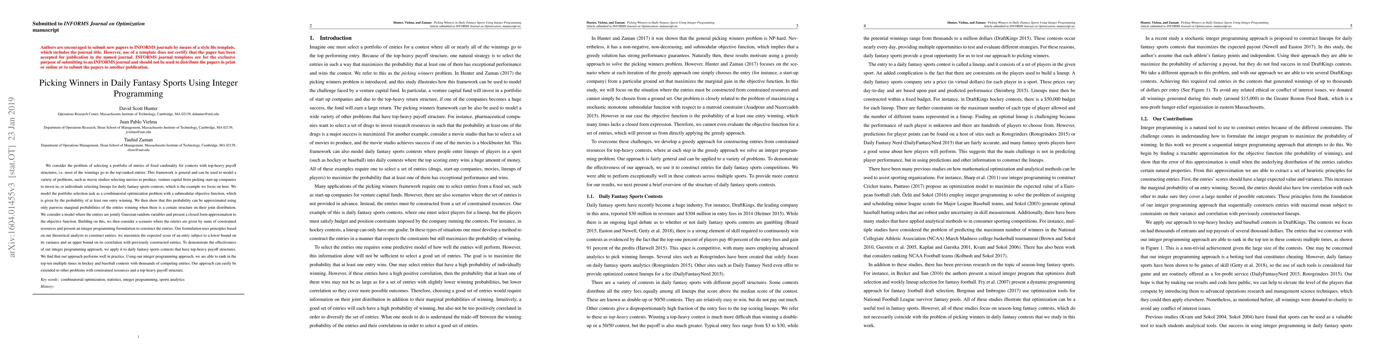 This paper proposes an integer programming approach to select optimal portfolios for daily fantasy sports contests with top-heavy payoff structures. It uses a combinatorial optimization problem with a submodular objective function to maximize the probability of winning, demonstrating effectiveness through successful top-ten rankings in hockey and baseball contests.