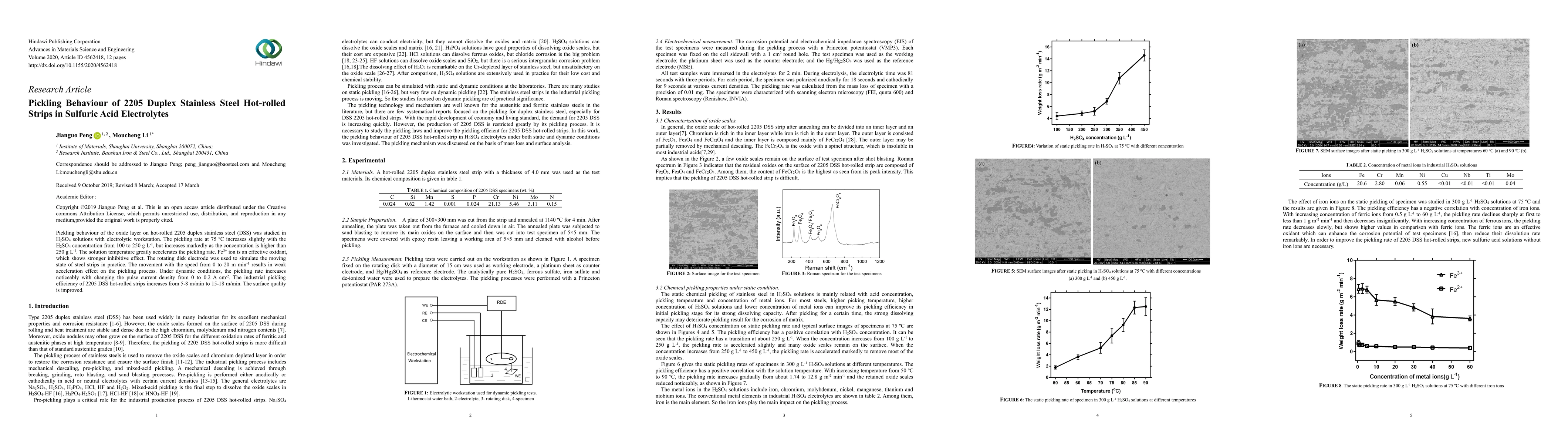 Pickling behaviour of the oxide layer on hot-rolled 2205 duplex stainless steel (DSS) was studied in H2SO4 solutions with electrolytic workstation.