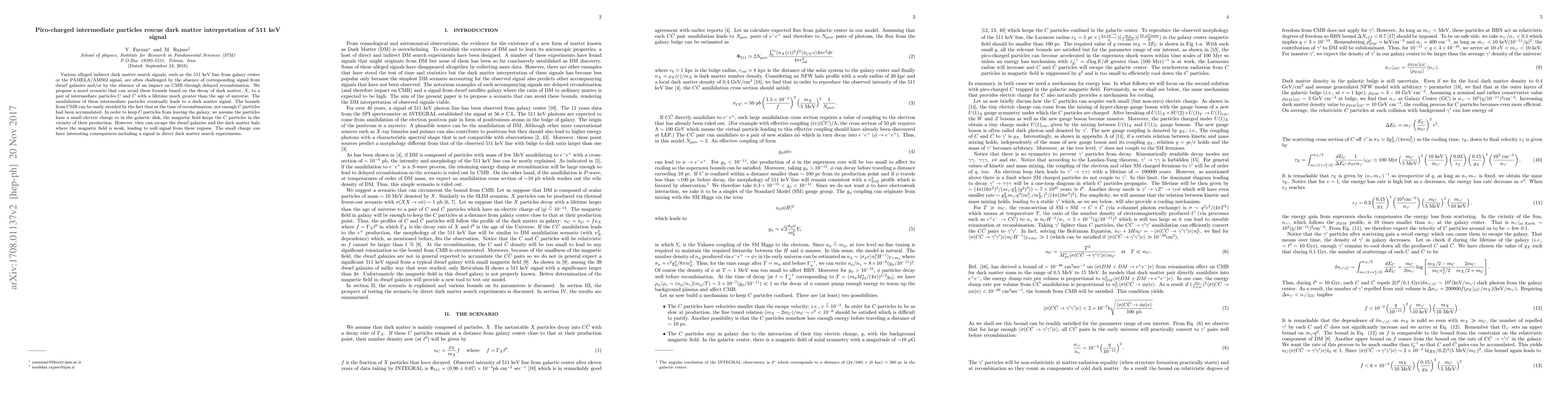 Various alleged indirect dark matter search signals, such as the 511 keV line from galaxy center or the PAMELA/AMS02 signal, are often challenged by the absence of corresponding signal from dwarf galaxies and/or from the absence of an impact on CMB through delayed recombination. We propose a novel scenario that can avoid these bounds based on the decay of dark matter, X, to a pair of intermediate particles C and \bar{C} with a lifetime much greater than the age of universe. The annihilation of these intermediate particles eventually leads to a dark matter signal. The bounds from CMB can be easily avoided by the fact that at the time of recombination, not enough C particles had been accumulated. In order to keep C particles from leaving the galaxy, we assume the particles have a small electric charge so in the galactic disk, the magnetic field keeps the C particles in the vicinity of their production. However, they can escape the dwarf galaxies and the dark matter halo where the magnetic field is weak, leading to null signal from these regions. The small charge can have interesting consequences including a signal in direct dark matter searches.