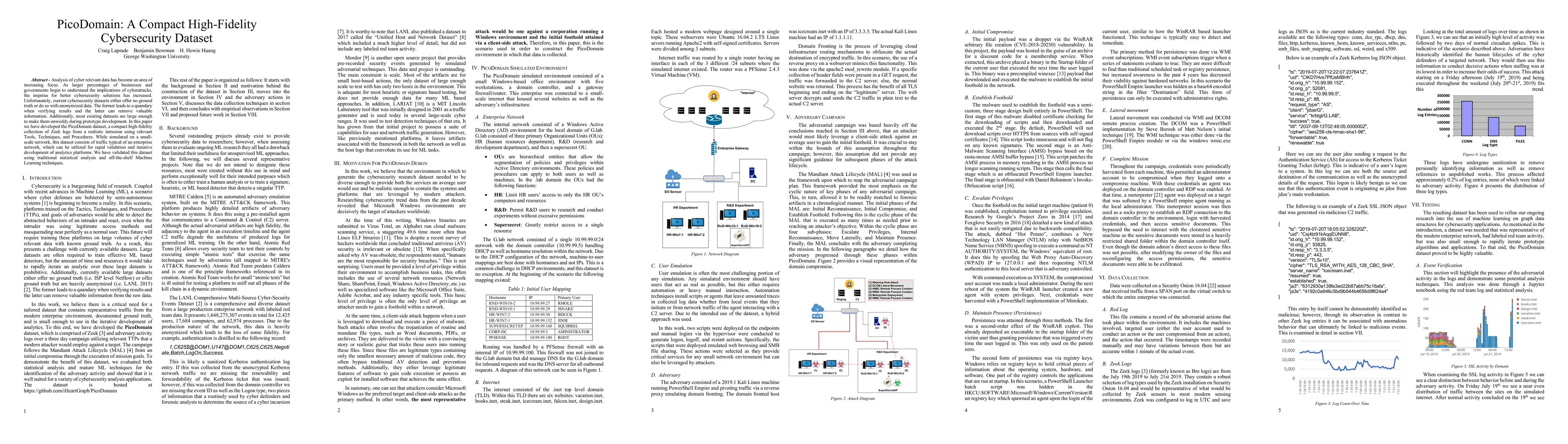 Analysis of cyber relevant data has become an area of increasing focus. As larger percentages of businesses and governments begin to understand the implications of cyberattacks, the impetus for better cybersecurity solutions has increased. Unfortunately, current cybersecurity datasets either offer no ground truth or do so with anonymized data. The former leads to a quandary when verifying results and the latter can remove valuable information. Additionally, most existing datasets are large enough to make them unwieldy during prototype development. In this paper we have developed the PicoDomain dataset, a compact high-fidelity collection of Zeek logs from a realistic intrusion using relevant Tools, Techniques, and Procedures. While simulated on a small-scale network, this dataset consists of traffic typical of an enterprise network, which can be utilized for rapid validation and iterative development of analytics platforms. We have validated this dataset using traditional statistical analysis and off-the-shelf Machine Learning techniques.
