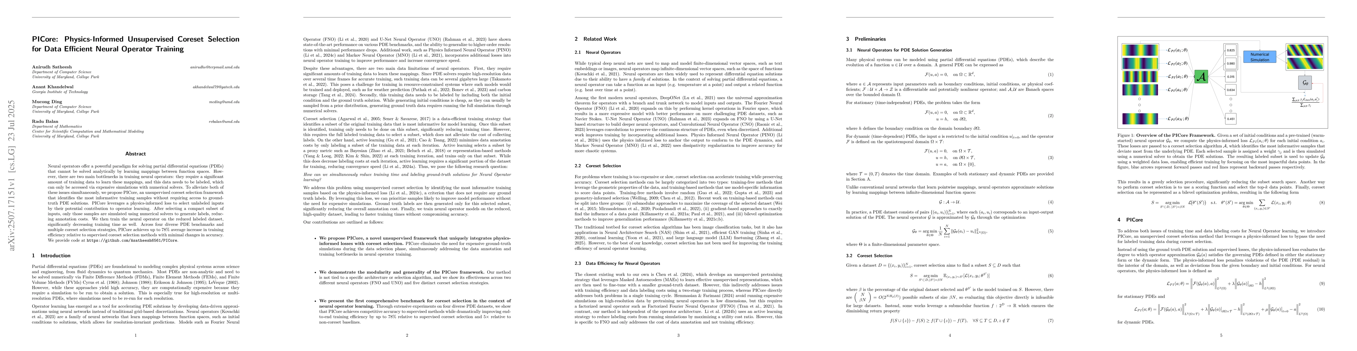 Neural operators offer a powerful paradigm for solving partial differential equations (PDEs) that cannot be solved analytically by learning mappings between function spaces. However, there are two main bottlenecks in training neural operators: they require a significant amount of training data to learn these mappings, and this data needs to be labeled, which can only be accessed via expensive simulations with numerical solvers. To alleviate both of these issues simultaneously, we propose PICore, an unsupervised coreset selection framework that identifies the most informative training samples without requiring access to ground-truth PDE solutions. PICore leverages a physics-informed loss to select unlabeled inputs by their potential contribution to operator learning. After selecting a compact subset of inputs, only those samples are simulated using numerical solvers to generate labels, reducing annotation costs. We then train the neural operator on the reduced labeled dataset, significantly decreasing training time as well. Across four diverse PDE benchmarks and multiple coreset selection strategies, PICore achieves up to 78% average increase in training efficiency relative to supervised coreset selection methods with minimal changes in accuracy. We provide code at https://github.com/Asatheesh6561/PICore.