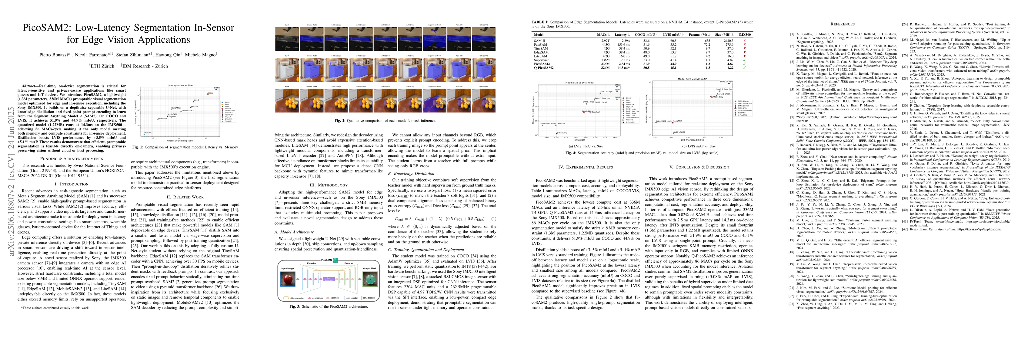 Real-time, on-device segmentation is critical for latency-sensitive and privacy-aware applications like smart glasses and IoT devices. We introduce PicoSAM2, a lightweight (1.3M parameters, 336M MACs) promptable segmentation model optimized for edge and in-sensor execution, including the Sony IMX500. It builds on a depthwise separable U-Net, with knowledge distillation and fixed-point prompt encoding to learn from the Segment Anything Model 2 (SAM2). On COCO and LVIS, it achieves 51.9% and 44.9% mIoU, respectively. The quantized model (1.22MB) runs at 14.3 ms on the IMX500-achieving 86 MACs/cycle, making it the only model meeting both memory and compute constraints for in-sensor deployment. Distillation boosts LVIS performance by +3.5% mIoU and +5.1% mAP. These results demonstrate that efficient, promptable segmentation is feasible directly on-camera, enabling privacy-preserving vision without cloud or host processing.