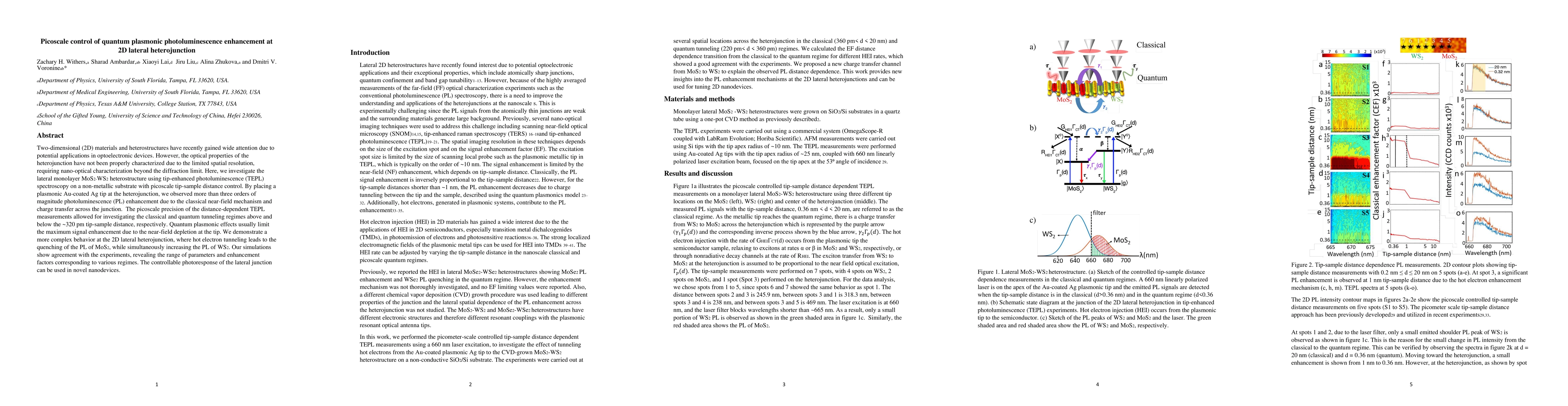 Two-dimensional (2D) materials and heterostructures have recently gained wide attention due to potential applications in optoelectronic devices. However, the optical properties of the heterojunction have not been properly characterized due to the limited spatial resolution, requiring nano-optical characterization beyond the diffraction limit. Here, we investigate the lateral monolayer MoS2-WS2 heterostructure using tip-enhanced photoluminescence (TEPL) spectroscopy on a non-metallic substrate with picoscale tip-sample distance control. By placing a plasmonic Au-coated Ag tip at the heterojunction, we observed more than three orders of magnitude photoluminescence (PL) enhancement due to the classical near-field mechanism and charge transfer across the junction. The picoscale precision of the distance-dependent TEPL measurements allowed for investigating the classical and quantum tunneling regimes above and below the ~320 pm tip-sample distance, respectively. Quantum plasmonic effects usually limit the maximum signal enhancement due to the near-field depletion at the tip. We demonstrate a more complex behavior at the 2D lateral heterojunction, where hot electron tunneling leads to the quenching of the PL of MoS2, while simultaneously increasing the PL of WS2. Our simulations show agreement with the experiments, revealing the range of parameters and enhancement factors corresponding to various regimes. The controllable photoresponse of the lateral junction can be used in novel nanodevices.