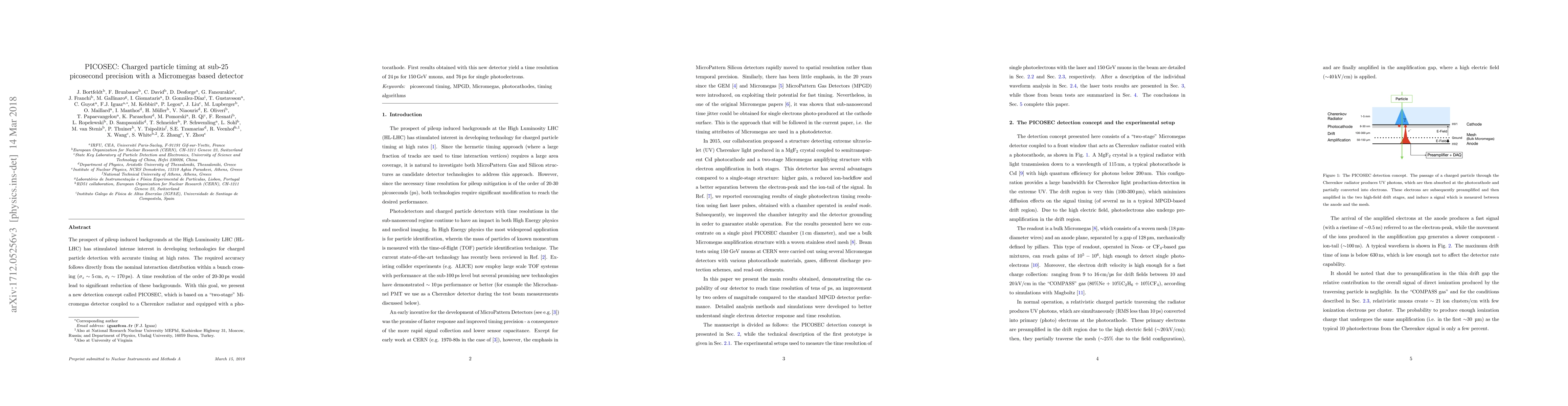 The PICOSEC detector, based on a "two-stage" Micromegas coupled with a Cherenkov radiator and photocathode, achieves sub-25 picosecond timing precision for charged particles, demonstrating a time resolution of 24 ps for 150 GeV muons and 76 ps for single photoelectrons. This technology aims to significantly reduce pileup backgrounds at the High Luminosity LHC.