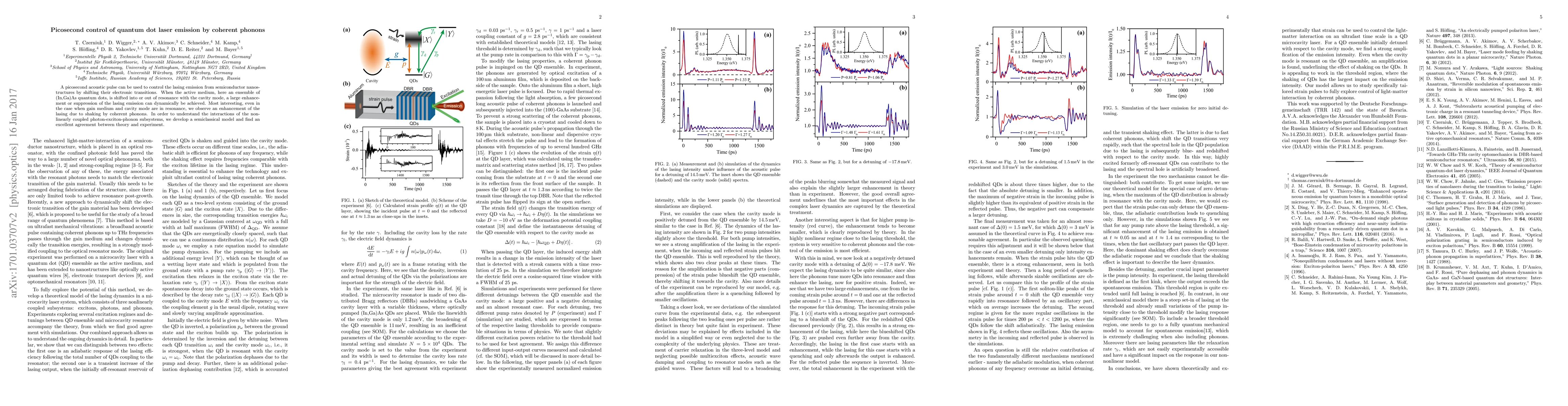 This paper demonstrates that picosecond acoustic pulses can dynamically control the emission of quantum dot lasers by shifting electronic transitions, achieving significant enhancement or suppression of lasing. Even when the gain medium and cavity mode are in resonance, coherent phonons can still enhance lasing, and a semiclassical model accurately describes these photon-exciton-phonon interactions.