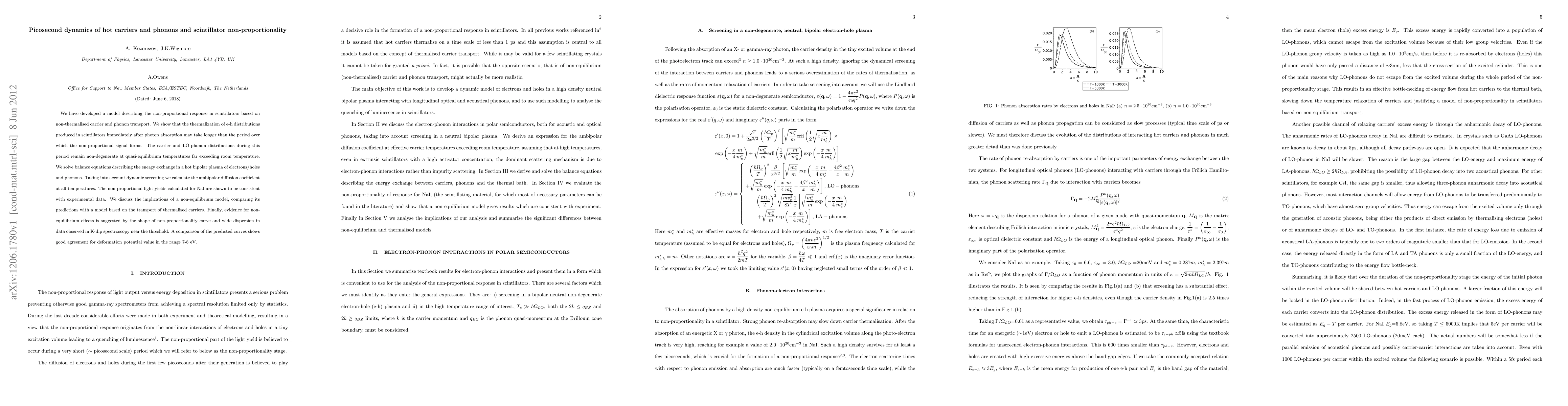 We have developed a model describing the non-proportional response in scintillators based on non-thermalised carrier and phonon transport. We show that the thermalization of e-h distributions produced in scintillators immediately after photon absorption may take longer than the period over which the non-proportional signal forms. The carrier and LO-phonon distributions during this period remain non-degenerate at quasi-equilibrium temperatures far exceeding room temperature. We solve balance equations describing the energy exchange in a hot bipolar plasma of electrons/holes and phonons. Taking into account dynamic screening we calculate the ambipolar diffusion coefficient at all temperatures. The non-proportional light yields calculated for NaI are shown to be consistent with experimental data. We discuss the implications of a non-equilibrium model, comparing its predictions with a model based on the transport of thermalised carriers. Finally, evidence for non-equilibrium effects is suggested by the shape of non-proportionality curve and wide dispersion in data observed in K-dip spectroscopy near the threshold. A comparison of the predicted curves shows good agreement for deformation potential value in the range 7-8 eV.
