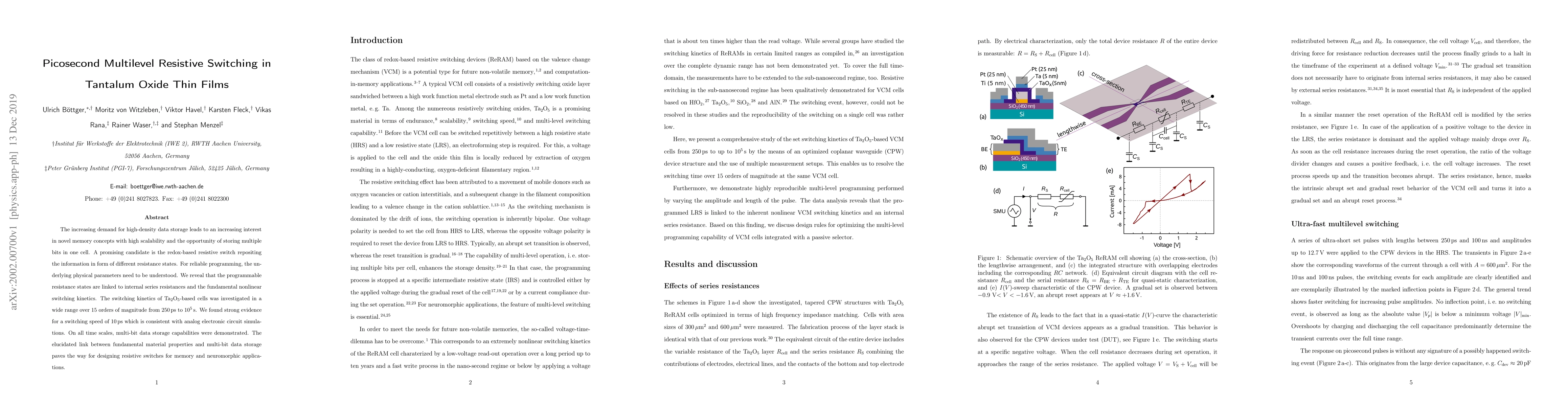 This paper investigates the resistive switching kinetics in tantalum oxide thin films, demonstrating picosecond switching speeds and multi-level resistance states, which are crucial for high-density data storage and neuromorphic applications. The study links these properties to internal series resistances and fundamental nonlinear switching kinetics.