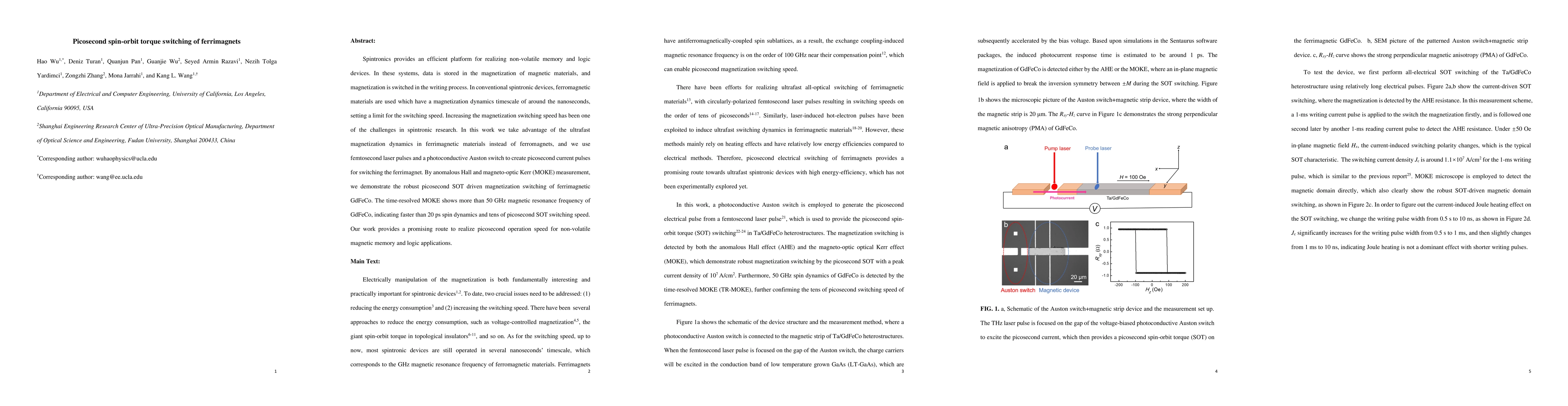 This paper demonstrates ultrafast magnetization switching in ferrimagnetic GdFeCo using picosecond spin-orbit torque (SOT) pulses generated by femtosecond lasers and a photoconductive switch, achieving over 50 GHz magnetic resonance frequency and a switching speed of tens of picoseconds. This approach promises enhanced speed for non-volatile magnetic memory and logic devices.