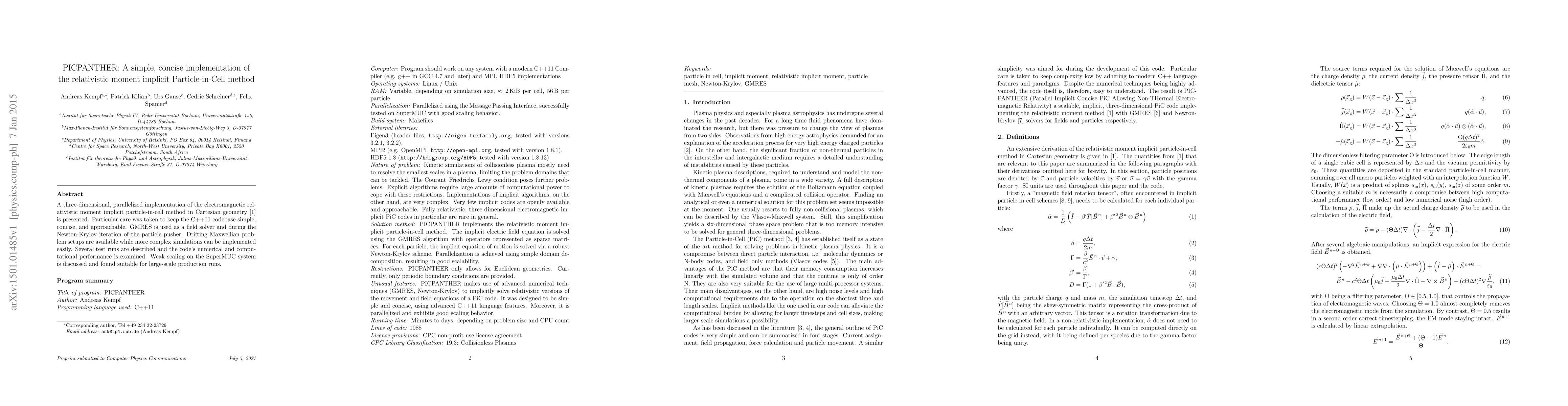 PICPANTHER is a simplified, parallelized C++11 implementation of the relativistic moment implicit Particle-in-Cell method, utilizing GMRES for field solver and Newton-Krylov iteration. It supports drifting Maxwellian setups and demonstrates good performance in weak scaling for large-scale simulations.