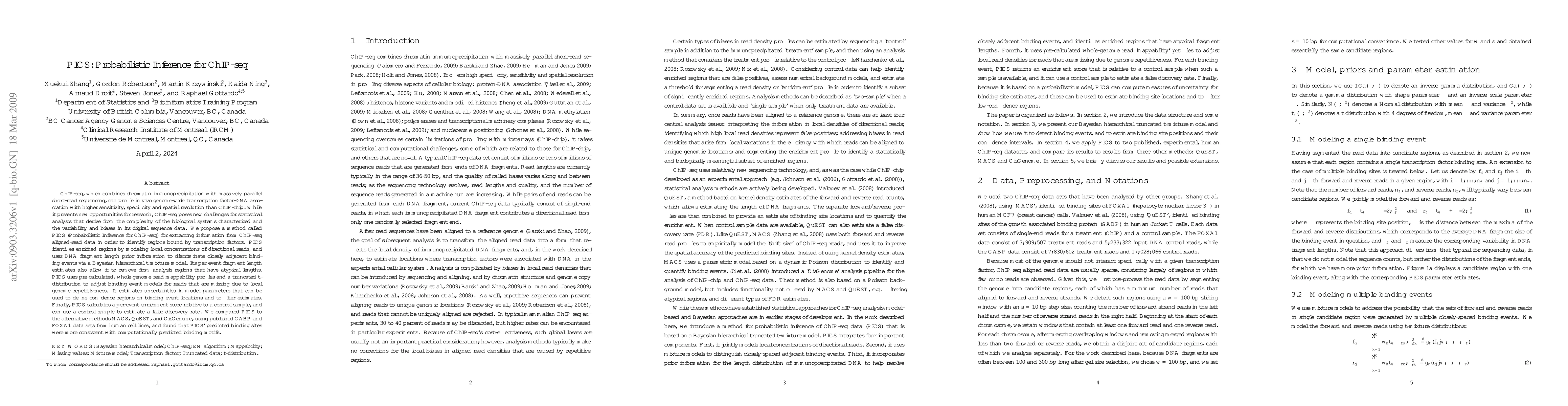 The PICS method is proposed for analyzing ChIP-seq data to identify transcription factor binding regions by modeling read concentrations and fragment lengths. PICS uses a Bayesian hierarchical t-mixture model to discriminate binding events and adjust for mappability and missing reads, providing confidence regions and false discovery rate estimates.