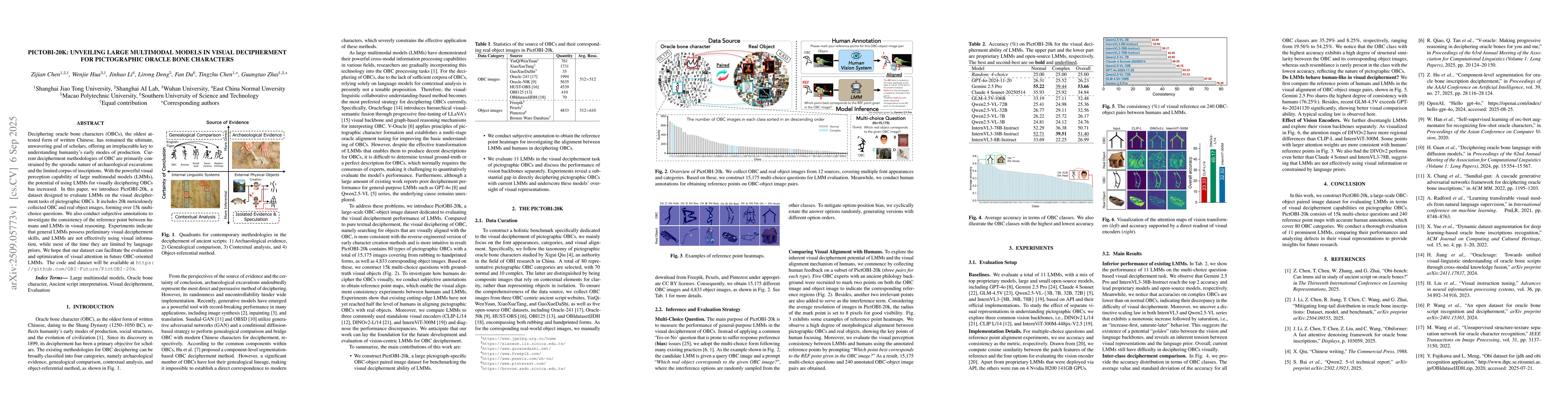 Deciphering oracle bone characters (OBCs), the oldest attested form of written Chinese, has remained the ultimate, unwavering goal of scholars, offering an irreplaceable key to understanding humanity's early modes of production. Current decipherment methodologies of OBC are primarily constrained by the sporadic nature of archaeological excavations and the limited corpus of inscriptions. With the powerful visual perception capability of large multimodal models (LMMs), the potential of using LMMs for visually deciphering OBCs has increased. In this paper, we introduce PictOBI-20k, a dataset designed to evaluate LMMs on the visual decipherment tasks of pictographic OBCs. It includes 20k meticulously collected OBC and real object images, forming over 15k multi-choice questions. We also conduct subjective annotations to investigate the consistency of the reference point between humans and LMMs in visual reasoning. Experiments indicate that general LMMs possess preliminary visual decipherment skills, and LMMs are not effectively using visual information, while most of the time they are limited by language priors. We hope that our dataset can facilitate the evaluation and optimization of visual attention in future OBC-oriented LMMs. The code and dataset will be available at https://github.com/OBI-Future/PictOBI-20k.