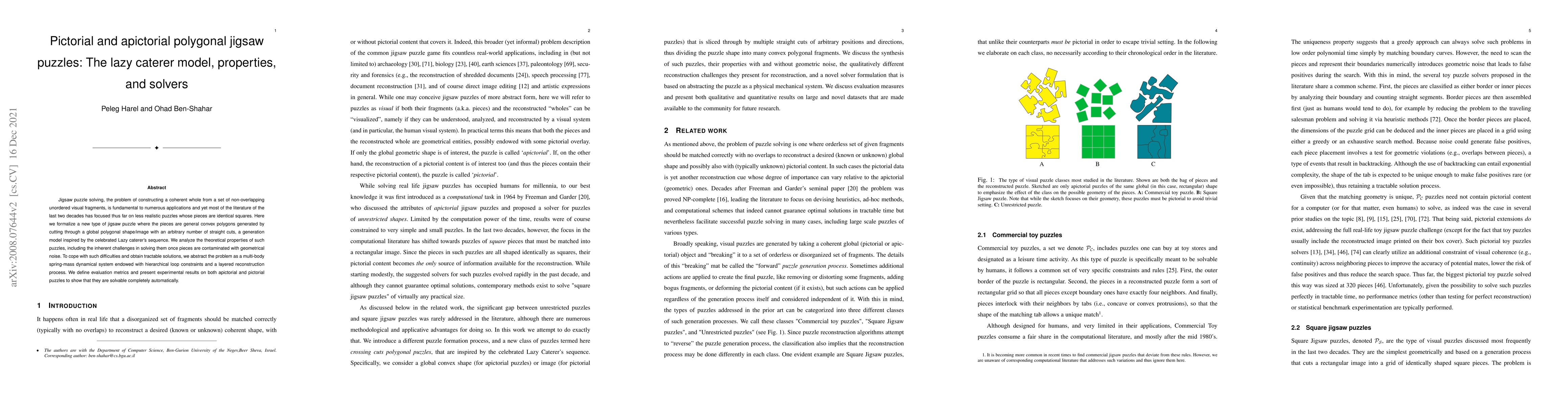 This paper introduces a new type of jigsaw puzzle with pieces formed by cutting general convex polygons from a polygonal shape, inspired by the Lazy caterer's sequence. It explores the theoretical properties and challenges of solving these puzzles, especially with noise, and proposes a multi-body spring-mass system for automated solving, demonstrating successful results on both apictorial and pictorial puzzles.
