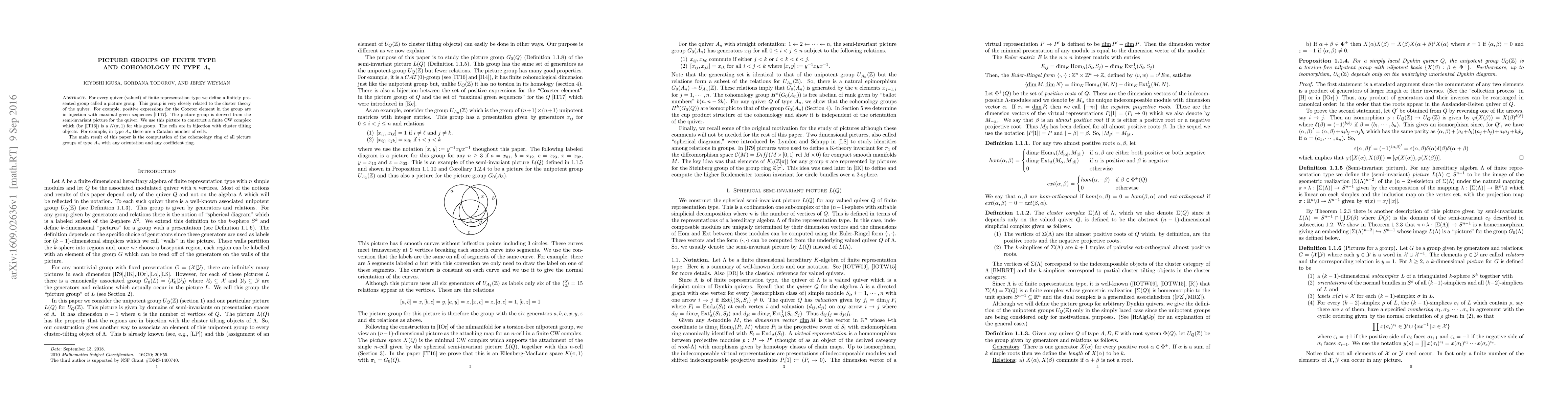 For every quiver (valued) of finite representation type we define a finitely presented group called a picture group. This group is very closely related to the cluster theory of the quiver. For example, positive expressions for the Coxeter element in the group are in bijection with maximal green sequences [IT17]. The picture group is derived from the semi-invariant picture for the quiver. We use this picture to construct a finite CW complex which (by [IT16]) is a $K(\pi,1)$ for this group. The cells are in bijection with cluster tilting objects. For example, in type $A_n$ there are a Catalan number of cells. The main result of this paper is the computation of the cohomology ring of all picture groups of type $A_n$ with any orientation and any coefficient ring.
