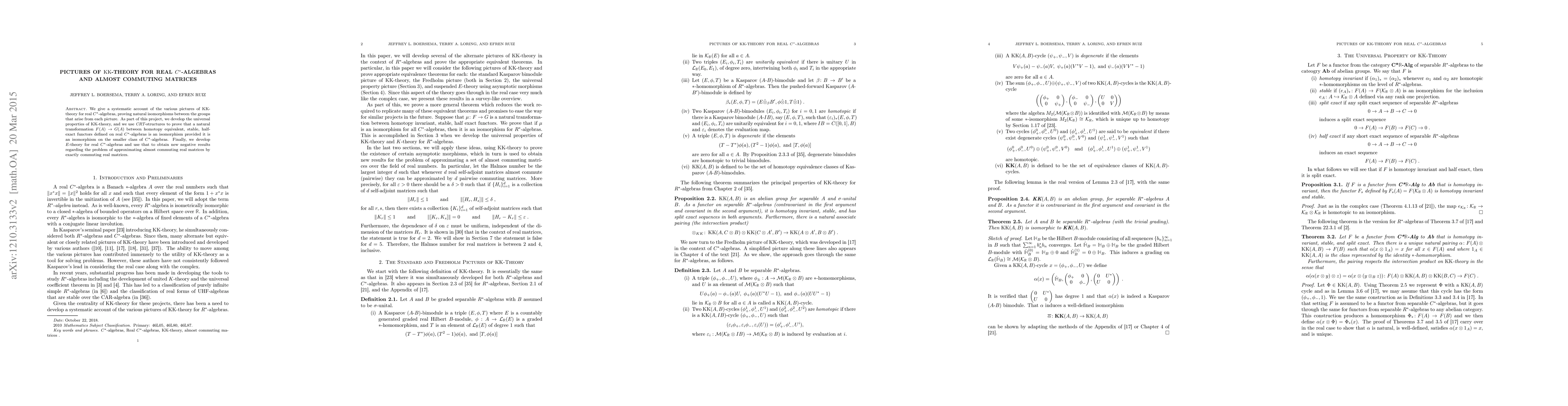 Summary: This paper systematically explores various KK-theory perspectives for real C*-algebras, establishes isomorphisms between resulting groups, and develops E-theory for these algebras. It also employs CRT-structures to demonstrate conditions under which natural transformations between functors are isomorphisms and uses this to yield new negative results on approximating almost commuting matrices.