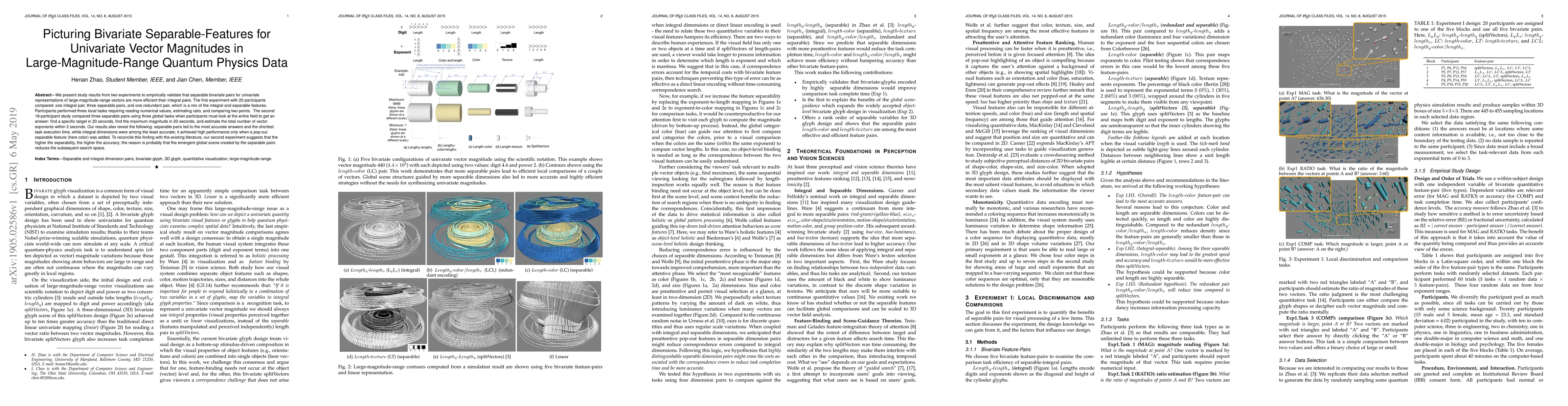 We present study results from two experiments to empirically validate that separable bivariate pairs for univariate representations of large-magnitude-range vectors are more efficient than integral pairs. The first experiment with 20 participants compared: one integral pair, three separable pairs, and one redundant pair, which is a mix of the integral and separable features. Participants performed three local tasks requiring reading numerical values, estimating ratio, and comparing two points. The second 18-participant study compared three separable pairs using three global tasks when participants must look at the entire field to get an answer: find a specific target in 20 seconds, find the maximum magnitude in 20 seconds, and estimate the total number of vector exponents within 2 seconds. Our results also reveal the following: separable pairs led to the most accurate answers and the shortest task execution time, while integral dimensions were among the least accurate; it achieved high performance only when a pop-out separable feature (here color) was added. To reconcile this finding with the existing literature, our second experiment suggests that the higher the separability, the higher the accuracy; the reason is probably that the emergent global scene created by the separable pairs reduces the subsequent search space.