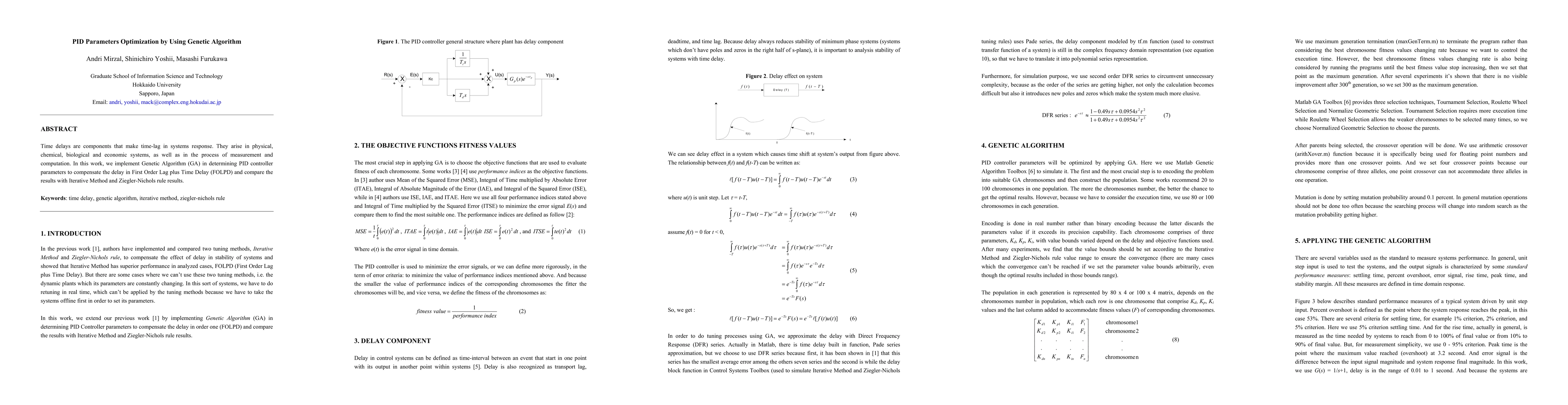 Time delays are components that make time-lag in systems response. They arise in physical, chemical, biological and economic systems, as well as in the process of measurement and computation. In this work, we implement Genetic Algorithm (GA) in determining PID controller parameters to compensate the delay in First Order Lag plus Time Delay (FOLPD) and compare the results with Iterative Method and Ziegler-Nichols rule results.