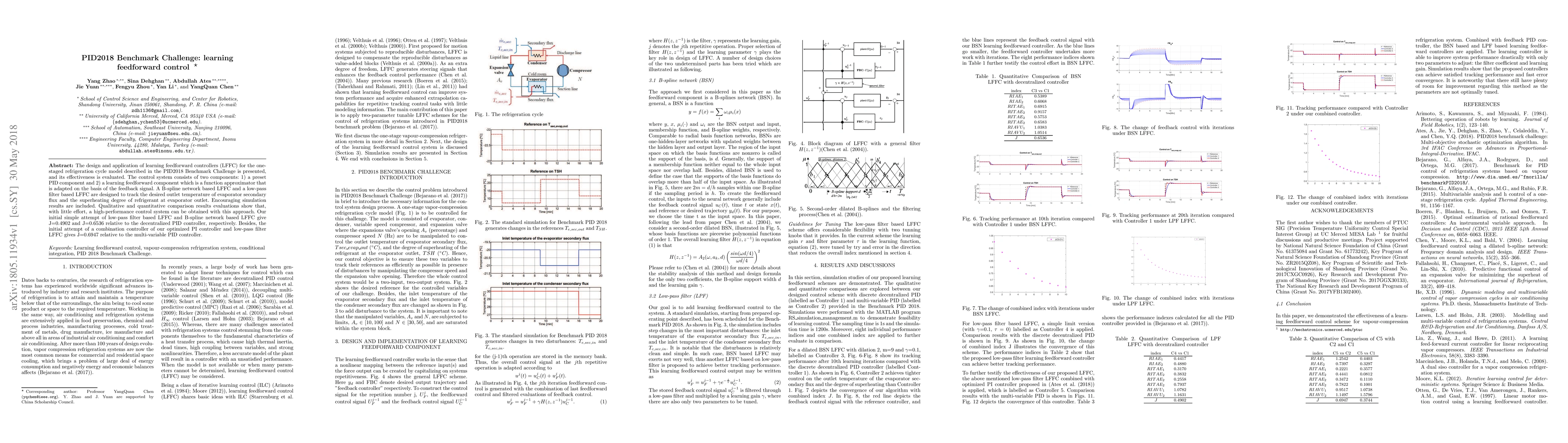 The design and application of learning feedforward controllers (LFFC) for the one-staged refrigeration cycle model described in the PID2018 Benchmark Challenge is presented, and its effectiveness is evaluated. The control system consists of two components: 1) a preset PID component and 2) a learning feedforward component which is a function approximator that is adapted on the basis of the feedback signal. A B-spline network based LFFC and a low-pass filter based LFFC are designed to track the desired outlet temperature of evaporator secondary flux and the superheating degree of refrigerant at evaporator outlet. Encouraging simulation results are included. Qualitative and quantitative comparison results evaluations show that, with little effort, a high-performance control system can be obtained with this approach. Our initial simple attempt of low-pass filter based LFFC and B-spline network based LFFC give J=0.4902 and J=0.6536 relative to the decentralized PID controller, respectively. Besides, the initial attempt of a combination controller of our optimized PI controller and low-pass filter LFFC gives J=0.6947 relative to the multi-variable PID controller.