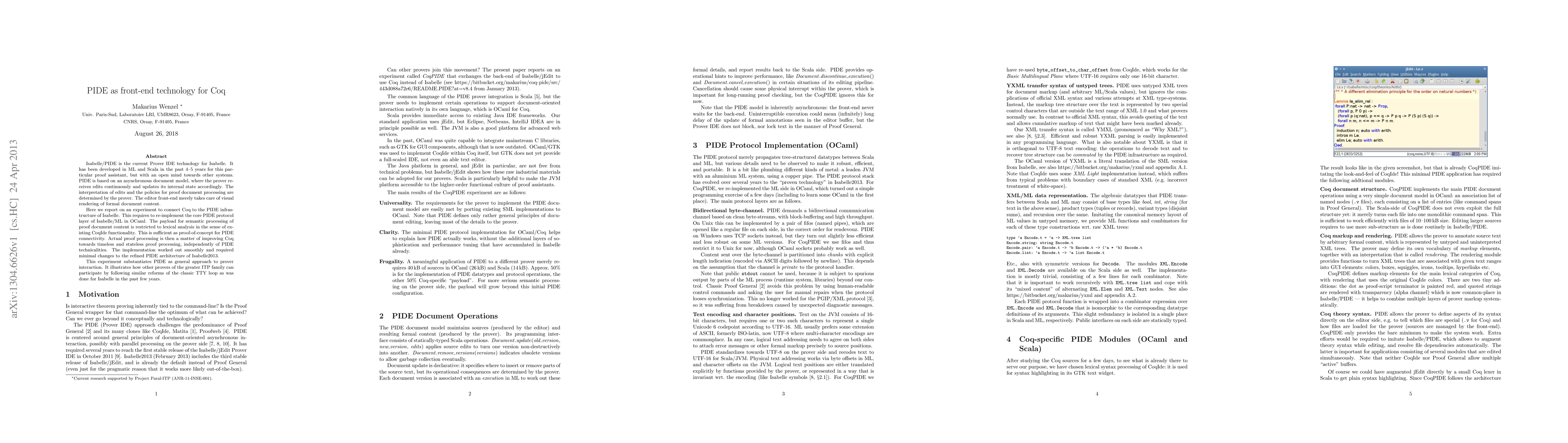 This paper explores integrating Coq with the PIDE infrastructure of Isabelle, demonstrating that PIDE can serve as a front-end technology for various proof assistants. The experiment required minimal changes to PIDE and showed that other interactive theorem provers can adopt similar reforms to enhance their interaction.