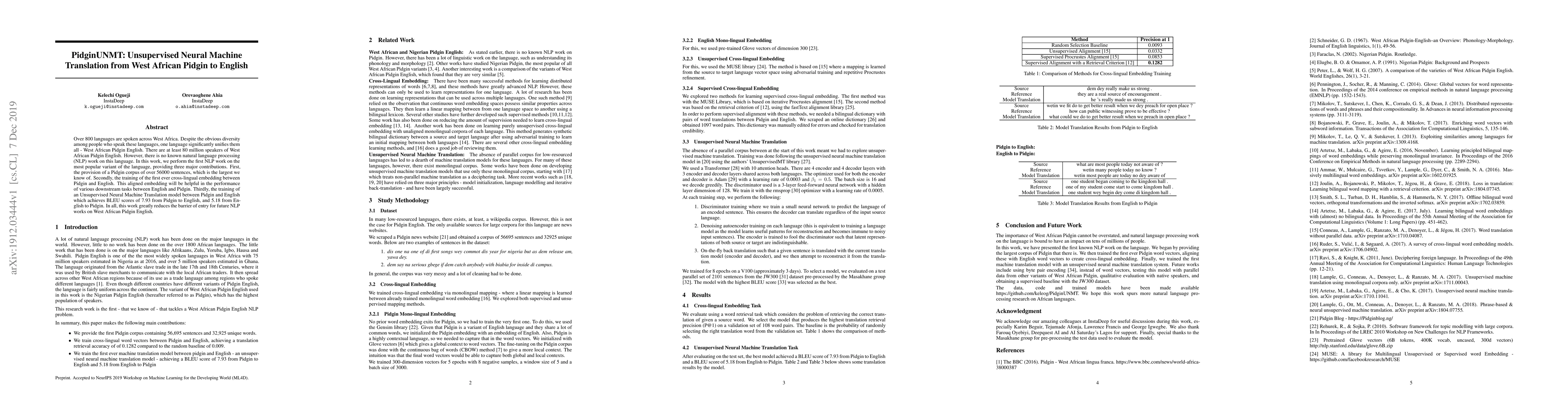 This paper presents the first natural language processing work on West African Pidgin English, including a large Pidgin corpus, a cross-lingual embedding, and an unsupervised neural machine translation model achieving BLEU scores of 7.93 and 5.18, significantly advancing research on this understudied language.