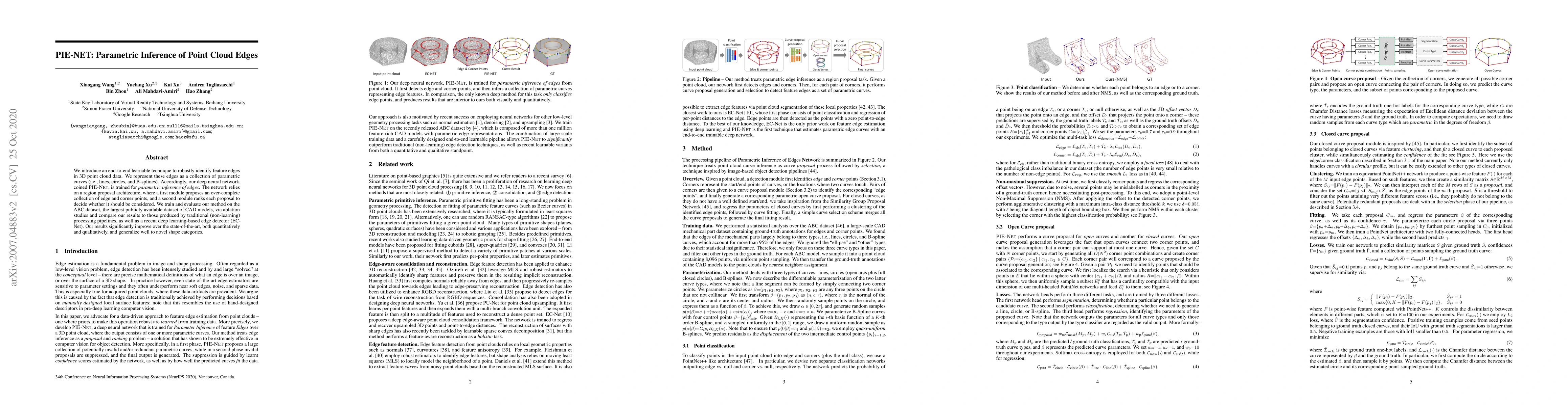 We introduce an end-to-end learnable technique to robustly identify feature edges in 3D point cloud data. We represent these edges as a collection of parametric curves (i.e.,lines, circles, and B-splines). Accordingly, our deep neural network, coined PIE-NET, is trained for parametric inference of edges. The network relies on a "region proposal" architecture, where a first module proposes an over-complete collection of edge and corner points, and a second module ranks each proposal to decide whether it should be considered. We train and evaluate our method on the ABC dataset, a large dataset of CAD models, and compare our results to those produced by traditional (non-learning) processing pipelines, as well as a recent deep learning based edge detector (EC-NET). Our results significantly improve over the state-of-the-art from both a quantitative and qualitative standpoint.