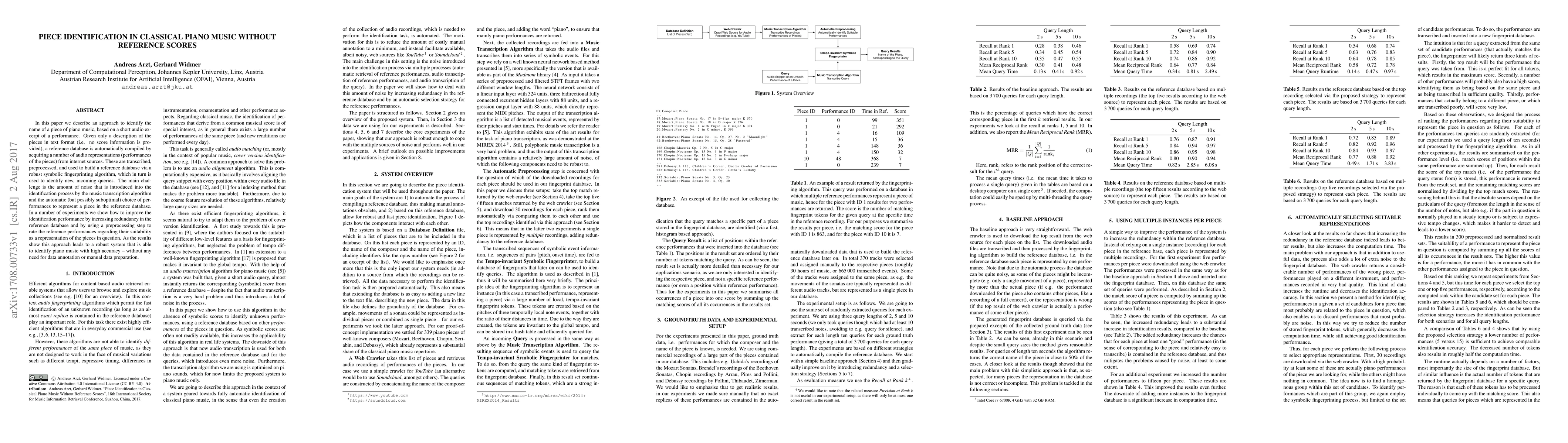 This paper presents a method for identifying classical piano music pieces from audio excerpts using a reference database built from internet performances, employing symbolic fingerprinting. The system addresses noise from transcription and performance selection, improving accuracy through database redundancy and performance suitability preprocessing.