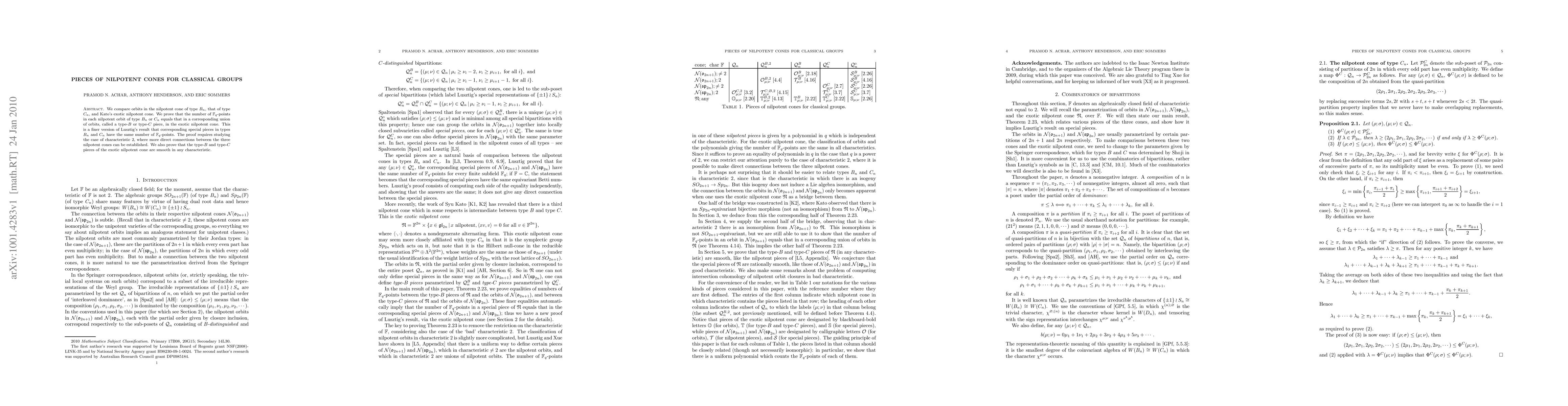 We compare orbits in the nilpotent cone of type $B_n$, that of type $C_n$, and Kato's exotic nilpotent cone. We prove that the number of $\F_q$-points in each nilpotent orbit of type $B_n$ or $C_n$ equals that in a corresponding union of orbits, called a type-$B$ or type-$C$ piece, in the exotic nilpotent cone. This is a finer version of Lusztig's result that corresponding special pieces in types $B_n$ and $C_n$ have the same number of $\F_q$-points. The proof requires studying the case of characteristic 2, where more direct connections between the three nilpotent cones can be established. We also prove that the type-$B$ and type-$C$ pieces of the exotic nilpotent cone are smooth in any characteristic.