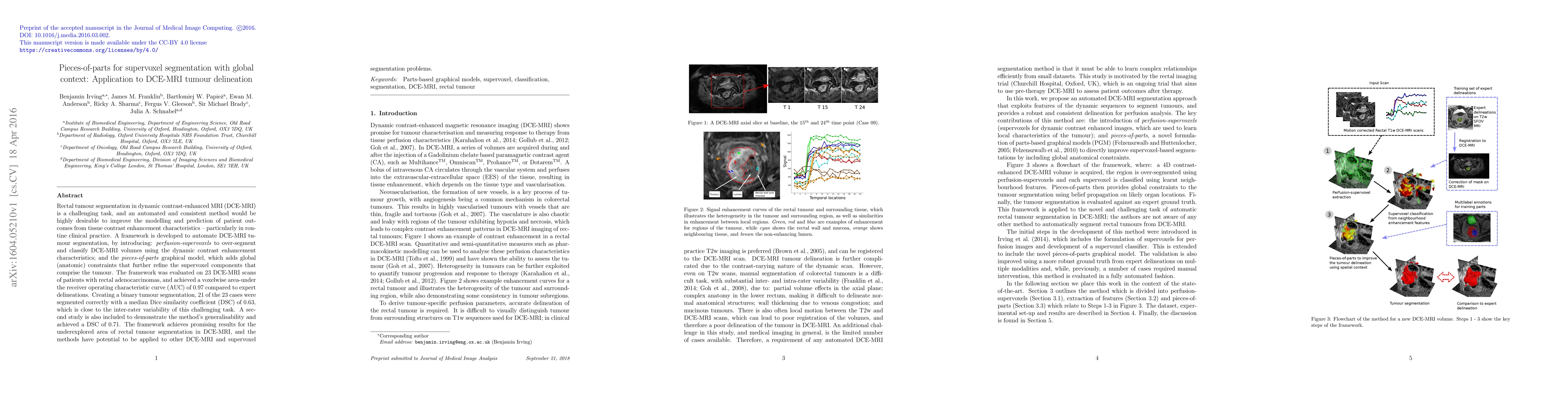 This paper presents an automated framework for rectal tumour segmentation in dynamic contrast-enhanced MRI (DCE-MRI) using perfusion-supervoxels and a pieces-of-parts graphical model to incorporate global anatomical constraints. The method achieved high accuracy, with a voxelwise AUC of 0.97 and a median Dice similarity coefficient of 0.63, demonstrating its potential for clinical use in rectal cancer.