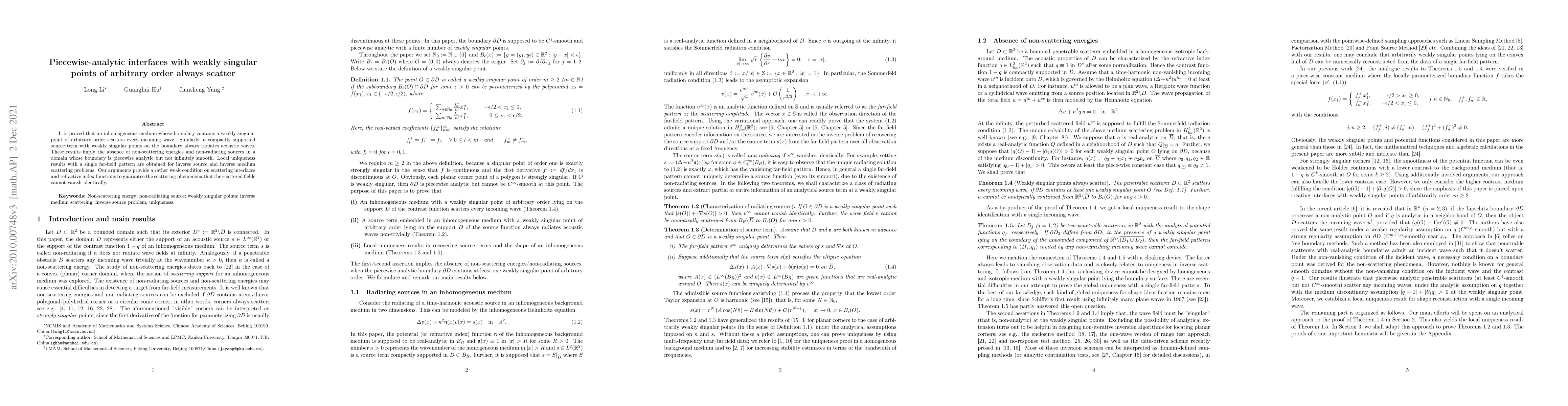 It is proved that an inhomogeneous medium whose boundary contains a weakly singular point of arbitrary order scatters every incoming wave. Similarly, a compactly supported source term with weakly singular points on the boundary always radiates acoustic waves. These results imply the absence of non-scattering energies and non-radiating sources in a domain that is not $C^\infty$-smooth. Local uniqueness results with a single far-field pattern are obtained for inverse source and inverse medium scattering problems. Our arguments provide a sufficient condition of the surface under which solutions to the Helmholtz equation admits no analytical continuation.