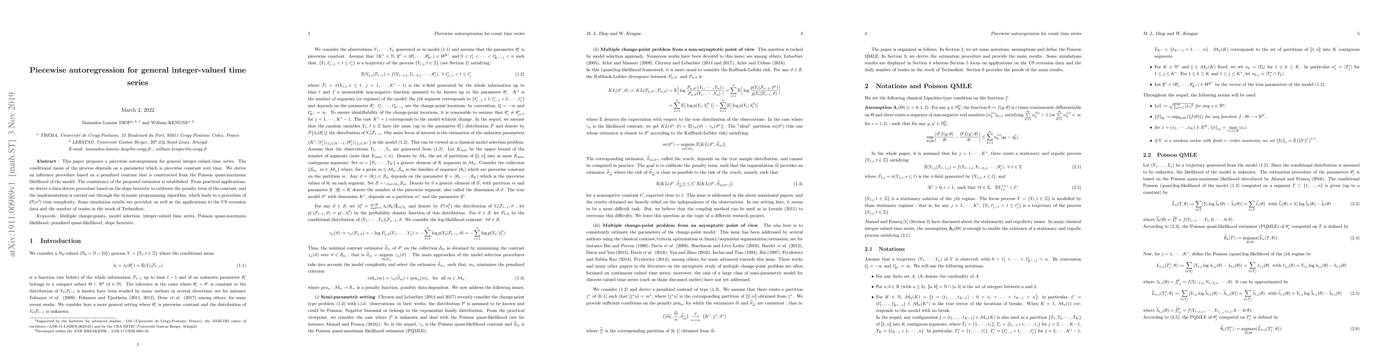 A piecewise autoregressive model with multiple change points is used to analyze count time series data.