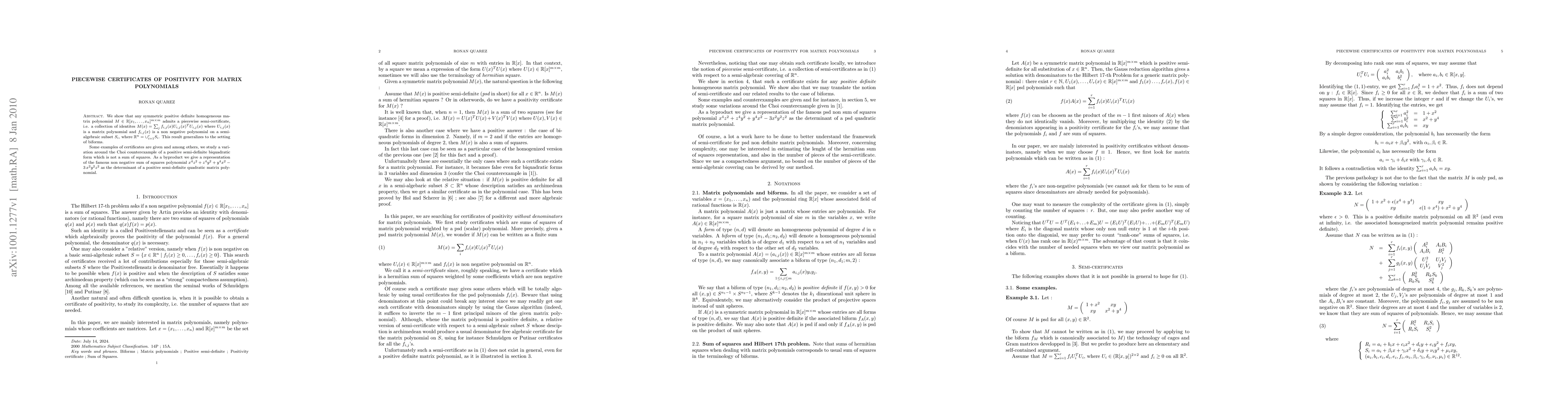 We show that any symmetric positive definite homogeneous matrix polynomial $M\in\R[x_1,...,x_n]^{m\times m}$ admits a piecewise semi-certificate, i.e. a collection of identites $M(x)=\sum_jf_{i,j}(x)U_{i,j}(x)^TU_{i,j}(x)$ where $U_{i,j}(x)$ is a matrix polynomial and $f_{i,j}(x)$ is a non negative polynomial on a semi-algebraic subset $S_i$, where $\R^n=\cup_{i=1}^r S_i$. This result generalizes to the setting of biforms. Some examples of certificates are given and among others, we study a variation around the Choi counterexample of a positive semi-definite biquadratic form which is not a sum of squares. As a byproduct we give a representation of the famous non negative sum of squares polynomial $x^4z^2+z^4y^2+y^4x^2-3 x^2y^2z^2$ as the determinant of a positive semi-definite quadratic matrix polynomial.