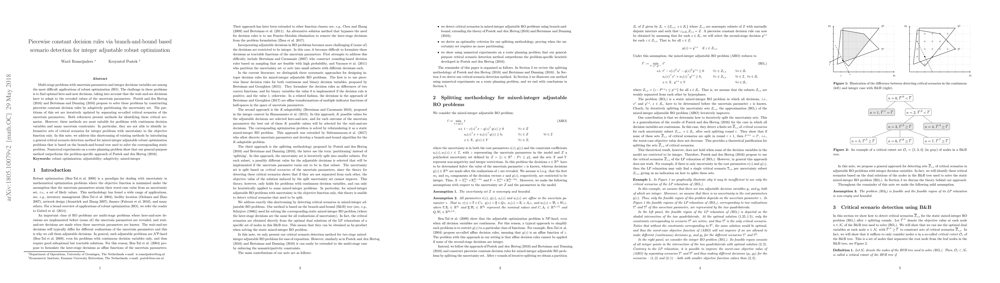 Multi-stage problems with uncertain parameters and integer decisions variables are among the most difficult applications of robust optimization (RO). The challenge in these problems is to find optimal here-and-now decisions, taking into account that the wait-and-see decisions have to adapt to the revealed values of the uncertain parameters. Postek and den Hertog (2016) and Bertsimas and Dunning (2016) propose to solve these problems by constructing piecewise constant decision rules by adaptively partitioning the uncertainty set. The partitions of this set are iteratively updated by separating so-called critical scenarios of the uncertain parameters. Both references present methods for identifying these critical scenarios. However, these methods are most suitable for problems with continuous decision variables and many uncertain constraints. In particular, they are not able to identify informative sets of critical scenarios for integer problems with uncertainty in the objective function only. In this note, we address this shortcoming of existing methods by introducing a general critical scenario detection method for mixed-integer adjustable robust optimization problems that is based on the branch-and-bound tree used to solve the corresponding static problem. Numerical experiments on a route planning problem show that our general-purpose method outperforms the problem-specific approach of Postek and den Hertog (2016).