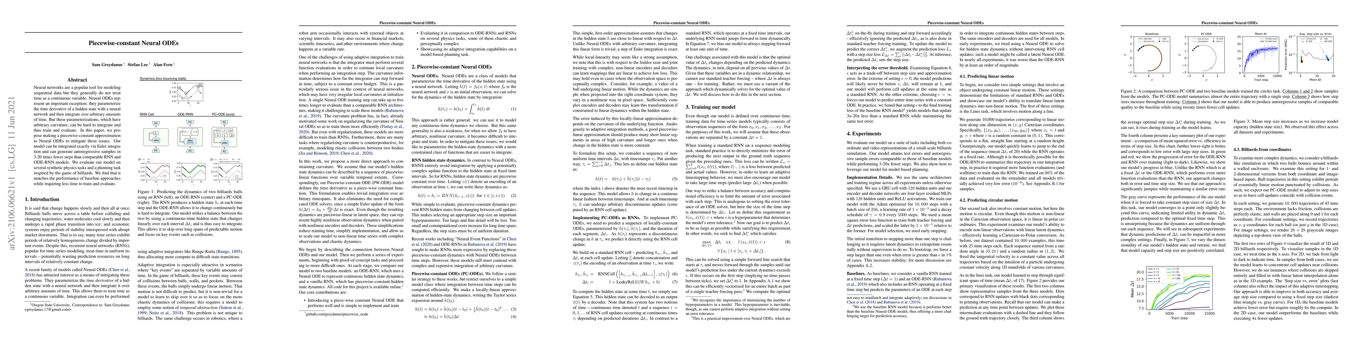 This paper proposes a piecewise-constant approximation to Neural ODEs to simplify integration and training. The model integrates exactly via Euler integration and generates autoregressive samples faster than RNN and ODE-RNN models, achieving comparable performance in synthetic physics and planning tasks.