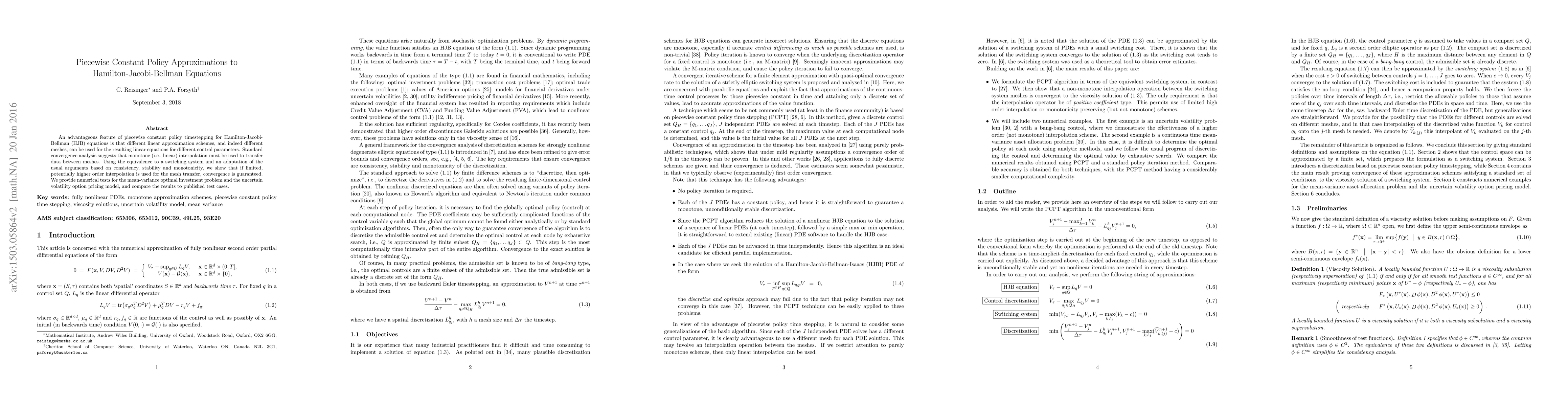 This paper explores piecewise constant policy approximations for solving Hamilton-Jacobi-Bellman equations, demonstrating that higher-order interpolation methods can be used for mesh transfer without compromising convergence, unlike standard monotone interpolation. Numerical tests on optimal investment and option pricing models confirm the effectiveness of this approach.