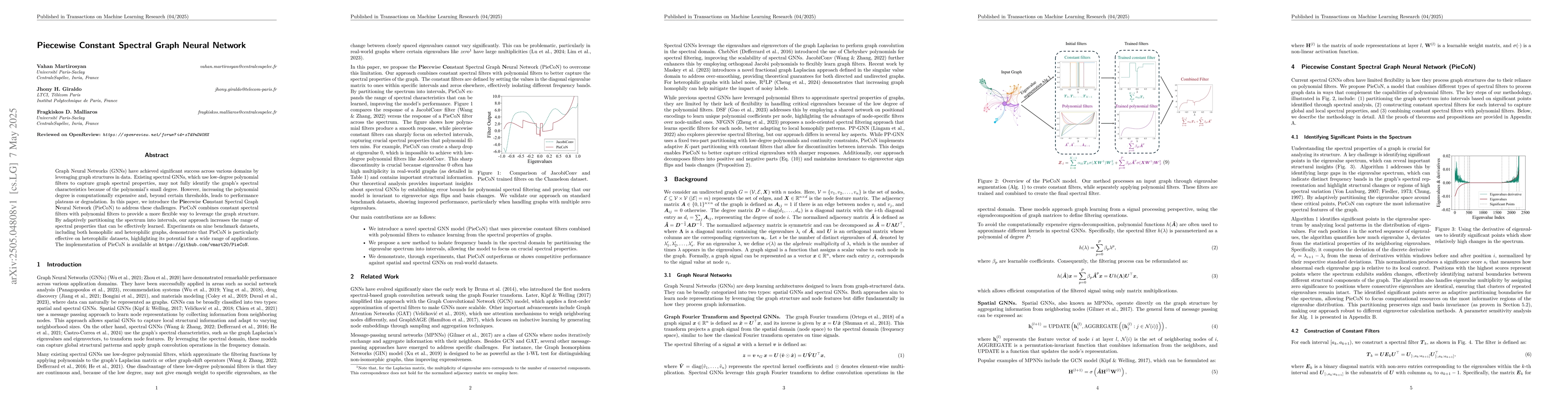 The Piecewise Constant Spectral Graph Neural Network (PieCoN) combines constant and polynomial filters to flexibly leverage graph structures, adaptively partitioning the spectrum to enhance learning of spectral properties. Experiments show PieCoN's effectiveness, especially on heterophilic graphs, across various applications.