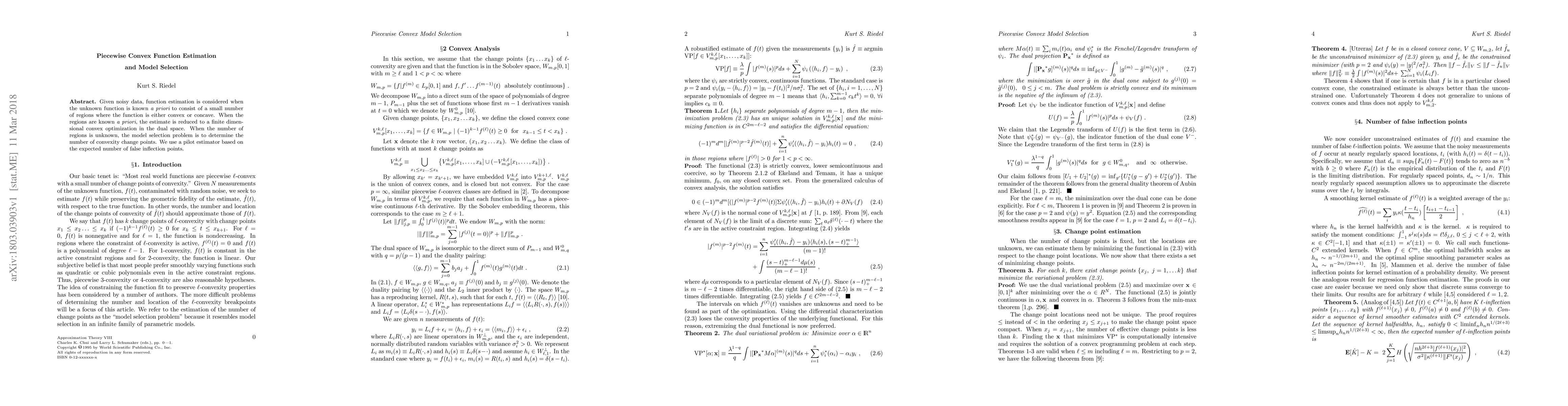Given noisy data, function estimation is considered when the unknown function is known apriori to consist of a small number of regions where the function is either convex or concave. When the regions are known apriori, the estimate is reduced to a finite dimensional convex optimization in the dual space. When the number of regions is unknown, the model selection problem is to determine the number of convexity change points. We use a pilot estimator based on the expected number of false inflection points.