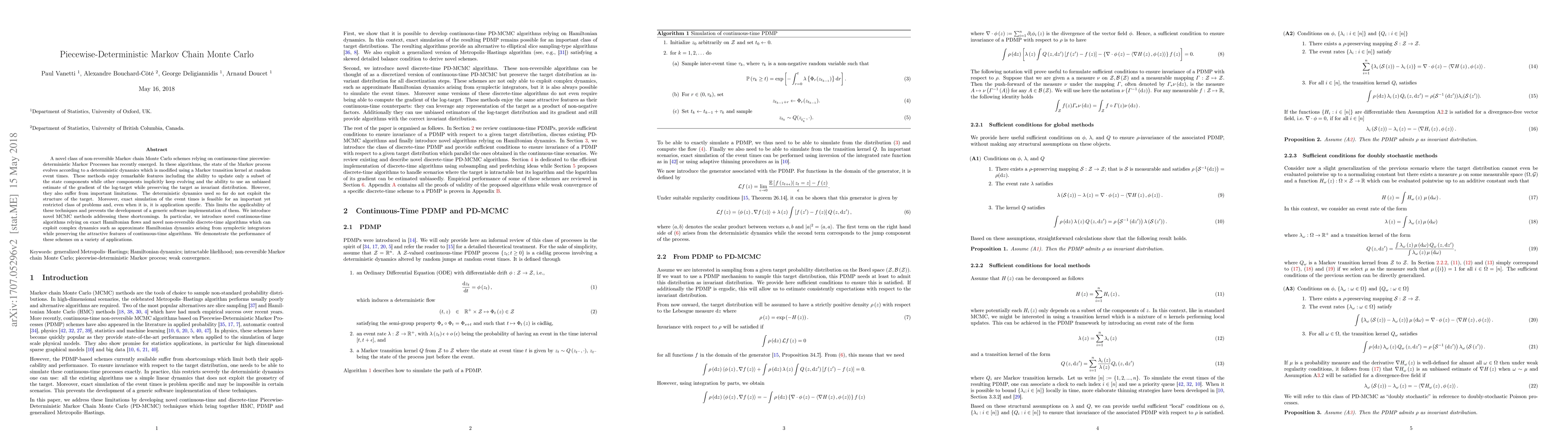 This paper introduces novel Markov Chain Monte Carlo (MCMC) methods based on continuous-time piecewise-deterministic Markov Processes, utilizing exact Hamiltonian flows and non-reversible discrete-time algorithms to address the limitations of existing methods, thereby enhancing their applicability and performance across various applications.