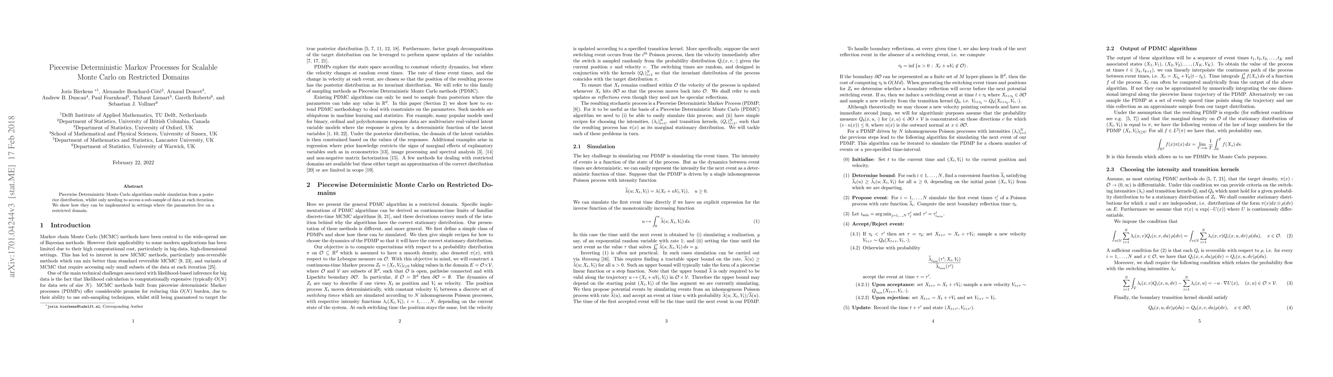 Summary: This paper explores the implementation of Piecewise Deterministic Monte Carlo algorithms for scalable posterior simulations, demonstrating their effectiveness in scenarios where parameters are confined to restricted domains. The approach allows for efficient data sampling by utilizing only a subset of available data at each iteration.