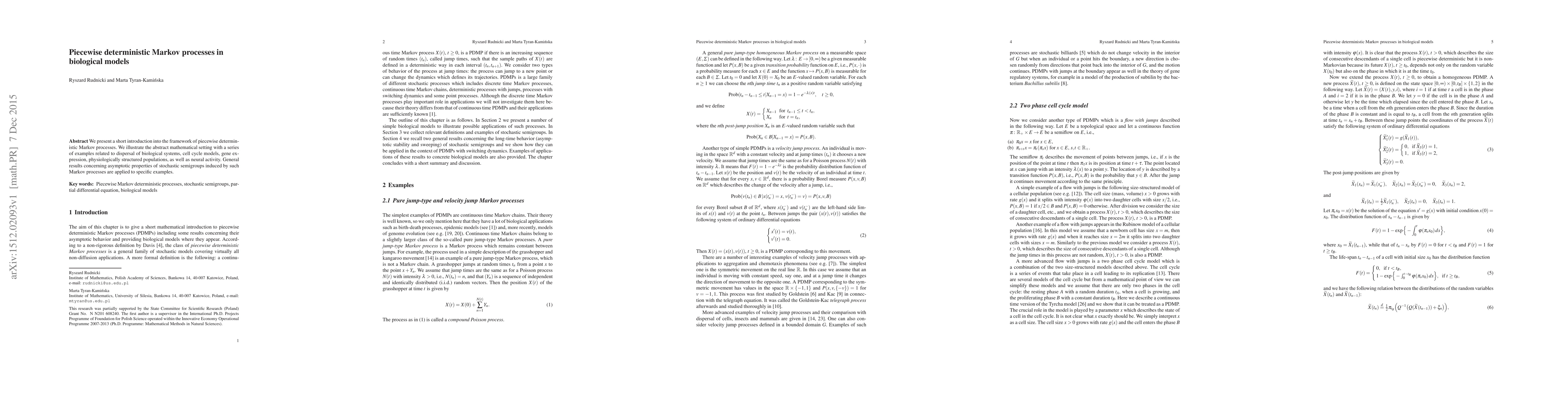 This paper introduces piecewise deterministic Markov processes, illustrating their application in biological models such as dispersal, cell cycles, gene expression, and neural activity. It also discusses general results on the asymptotic properties of stochastic semigroups in these contexts.