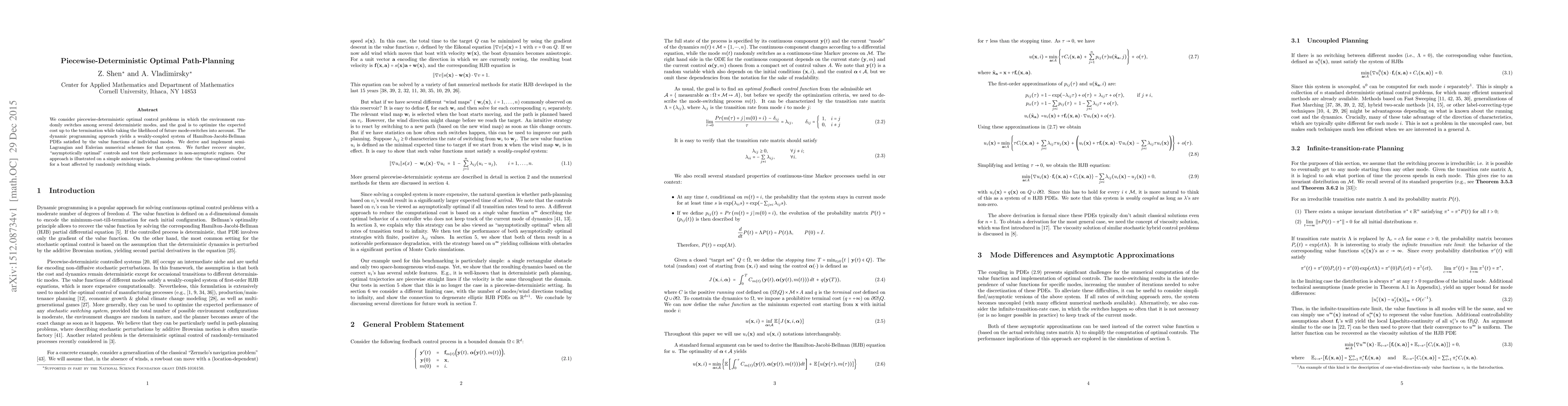 We consider piecewise-deterministic optimal control problems in which the environment randomly switches among several deterministic modes, and the goal is to optimize the expected cost up to the termination while taking the likelihood of future mode-switches into account. The dynamic programming approach yields a weakly-coupled system of Hamilton-Jacobi-Bellman PDEs satisfied by the value functions of individual modes. We derive and implement semi-Lagrangian and Eulerian numerical schemes for that system. We further recover simpler, "asymptotically optimal" controls and test their performance in non-asymptotic regimes. Our approach is illustrated on a simple anisotropic path-planning problem: the time-optimal control for a boat affected by randomly switching winds.