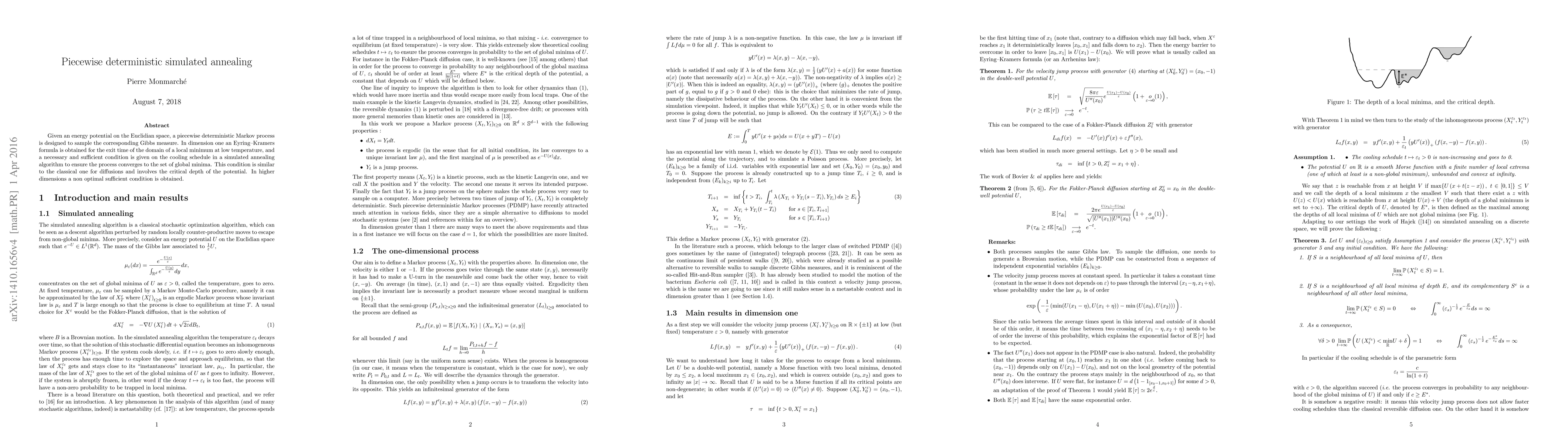 This paper develops a piecewise deterministic Markov process for sampling the Gibbs measure, deriving an Eyring-Kramers formula for exit times in low-temperature scenarios and establishing a necessary and sufficient cooling schedule condition for simulated annealing convergence to global minima, similar to classical diffusion conditions.