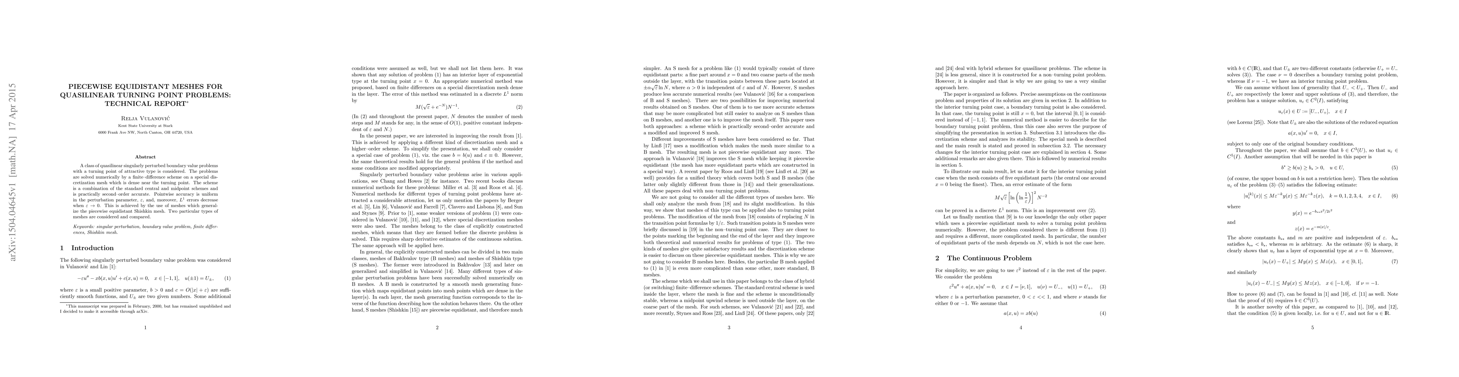 A class of quasilinear singularly perturbed boundary value problems with a turning point of attractive type is considered. The problems are solved numerically by a finite-difference scheme on a special discretization mesh which is dense near the turning point. The scheme is a combination of the standard central and midpoint schemes and is practically second-order accurate. Pointwise accuracy is uniform in the perturbation parameter and, moreover, L1 errors decrease when the perturbation parameter tends to 0. This is achieved by the use of meshes which generalize the piecewise equidistant Shishkin mesh. Two particular types of meshes are considered and compared.