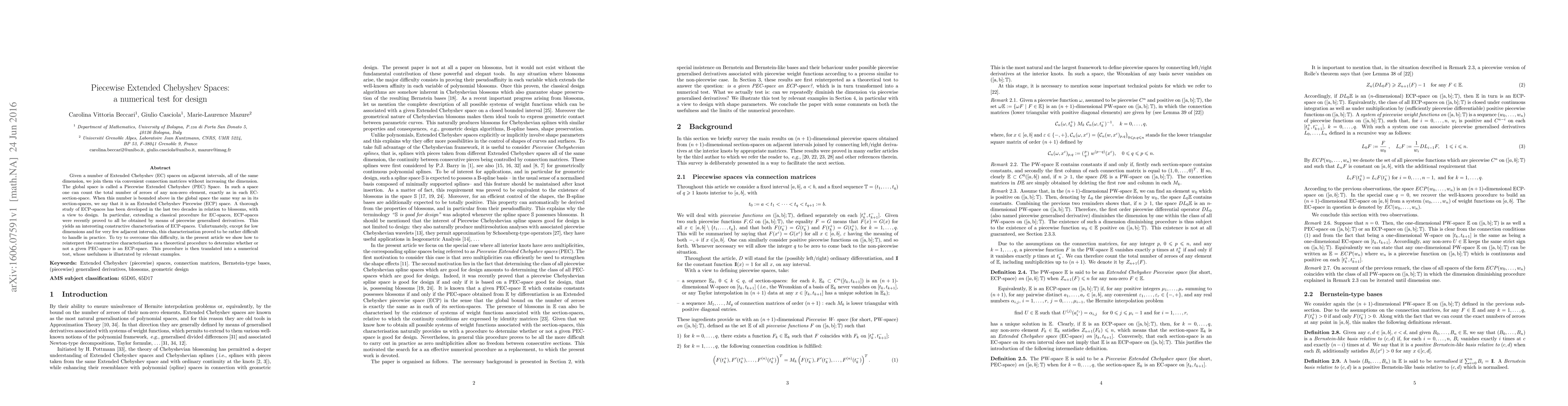 Given a number of Extended Chebyshev (EC) spaces on adjacent intervals, all of the same dimension, we join them via convenient connection matrices without increasing the dimension. The global space is called a Piecewise Extended Chebyshev (PEC) Space. In such a space one can count the total number of zeroes of any non-zero element, exactly as in each EC-section-space. When this number is bounded above in the global space the same way as in its section-spaces, we say that it is an Extended Chebyshev Piecewise (ECP) space. A thorough study of ECP-spaces has been developed in the last two decades in relation to blossoms, with a view to design. In particular, extending a classical procedure for EC-spaces, ECP-spaces were recently proved to all be obtained by means of piecewise generalised derivatives. This yields an interesting constructive characterisation of ECP-spaces. Unfortunately, except for low dimensions and for very few adjacent intervals, this characterisation proved to be rather difficult to handle in practice. To try to overcome this difficulty, in the present article we show how to reinterpret the constructive characterisation as a theoretical procedure to determine whether or not a given PEC-space is an ECP-space. This procedure is then translated into a numerical test, whose usefulness is illustrated by relevant examples.