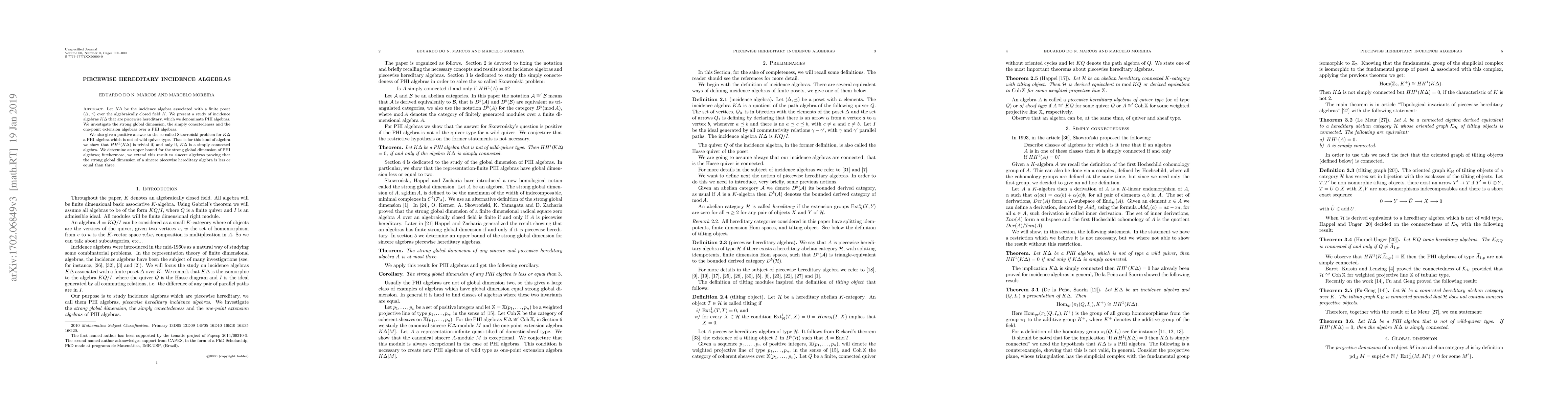 This paper studies piecewise hereditary incidence algebras (PHI algebras) and explores their strong global dimension, simple connectedness, and one-point extension algebras. It answers the Skowroński problem for non-wild quiver type PHI algebras, proving that $HH^1(K\Delta)$ is trivial if and only if $K\Delta$ is simply connected, and establishes an upper bound for the strong global dimension of PHI algebras, extending this to sincere algebras.