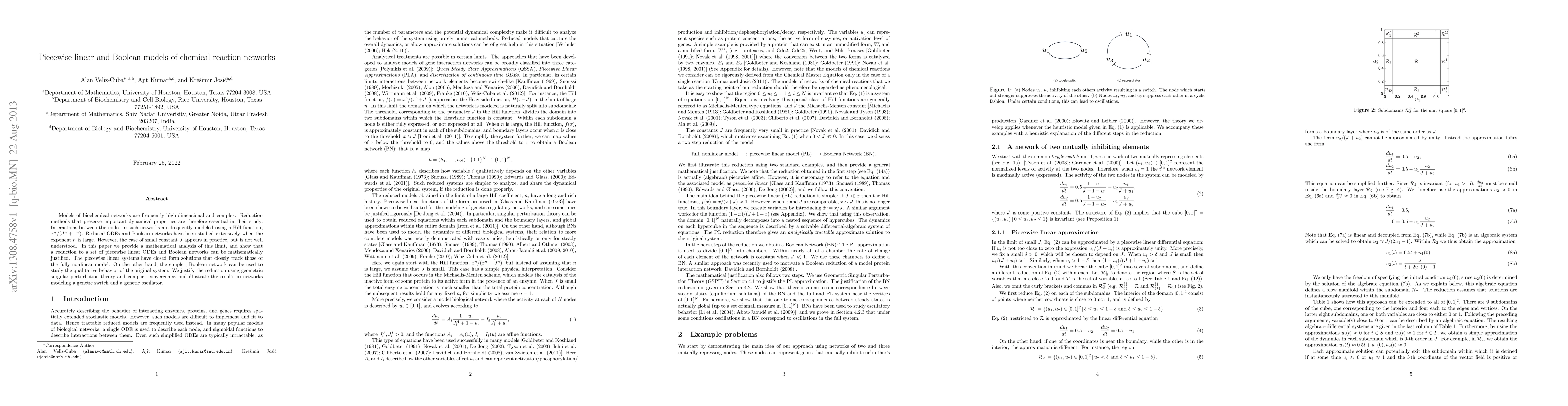 This paper analyzes the limit of biochemical networks where interactions are modeled using a small constant $J$, proposing reductions to piecewise linear ODEs and Boolean networks. It justifies these reductions mathematically, showing that they closely track the dynamics of the fully nonlinear model and can study the qualitative behavior of the system.