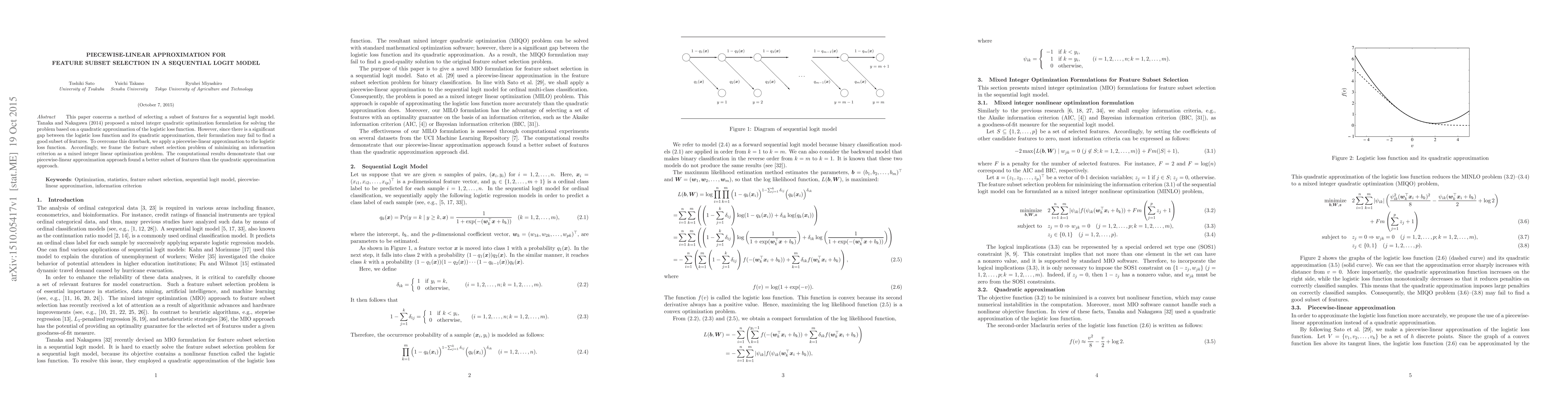 This paper proposes a piecewise-linear approximation method for feature subset selection in a sequential logit model, addressing the limitations of the quadratic approximation approach. The new method reformulates the problem as a mixed integer linear optimization, leading to better feature selection results.