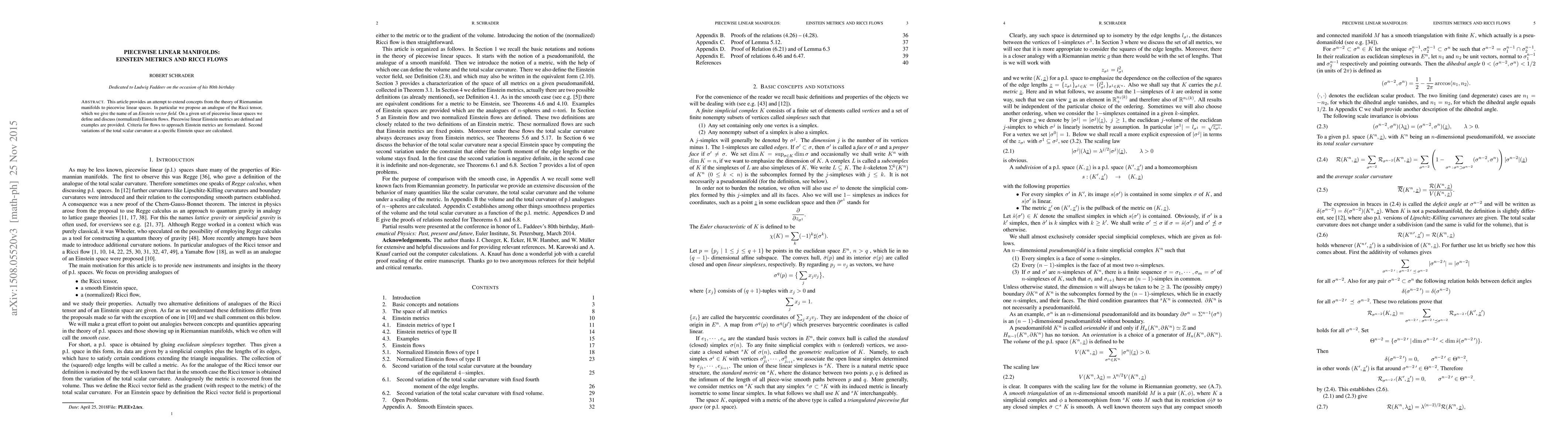This article provides an attempt to extend concepts from the theory of Riemannian manifolds to piecewise linear spaces. In particular we propose an analogue of the Ricci tensor, which we give the name of an Einstein vector field. On a given set of piecewise linear spaces we define and discuss (normalized) Ricci flows. Piecewise linear Einstein metrics are defined and examples are provided. Criteria for flows to approach Einstein metrics are formulated. Second variations of the total scalar curvature at a specific Einstein space are calculated.