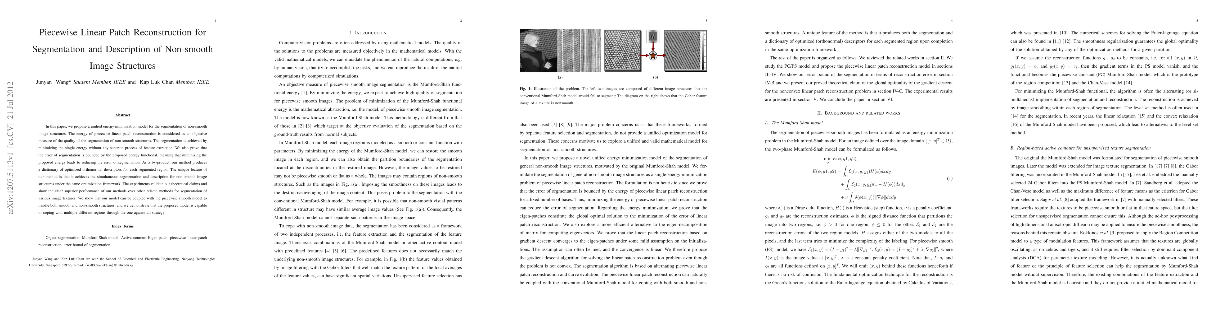 This paper proposes a unified energy minimization model for segmenting non-smooth image structures using piecewise linear patch reconstruction, achieving simultaneous segmentation and description with improved performance over related methods.