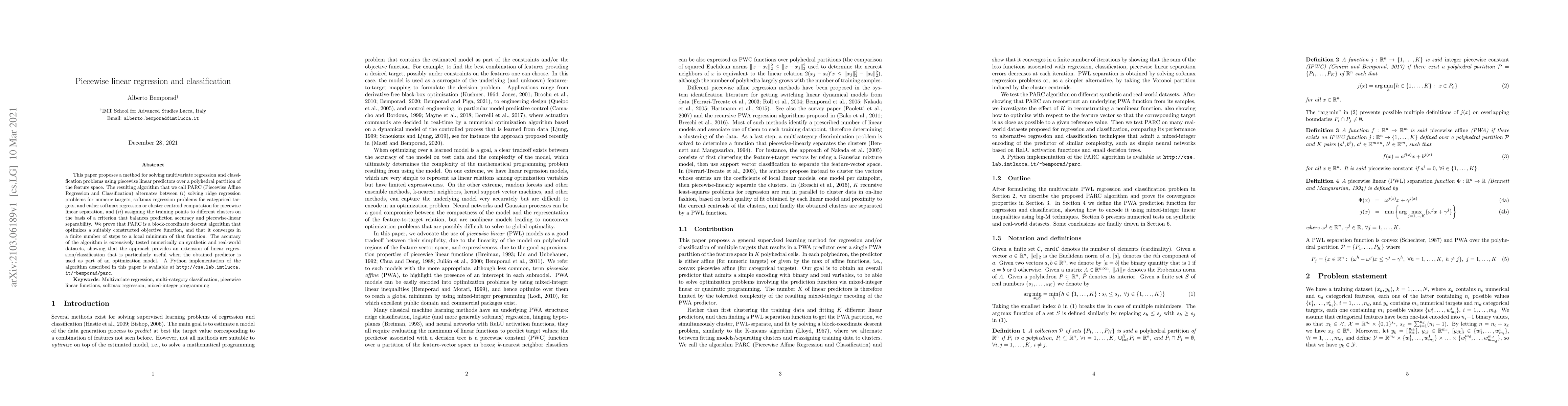 This paper introduces PARC, a method for multivariate regression and classification using piecewise linear predictors. It alternates between solving regression and clustering problems, proving convergence to a local minimum, and demonstrating its effectiveness on synthetic and real datasets.